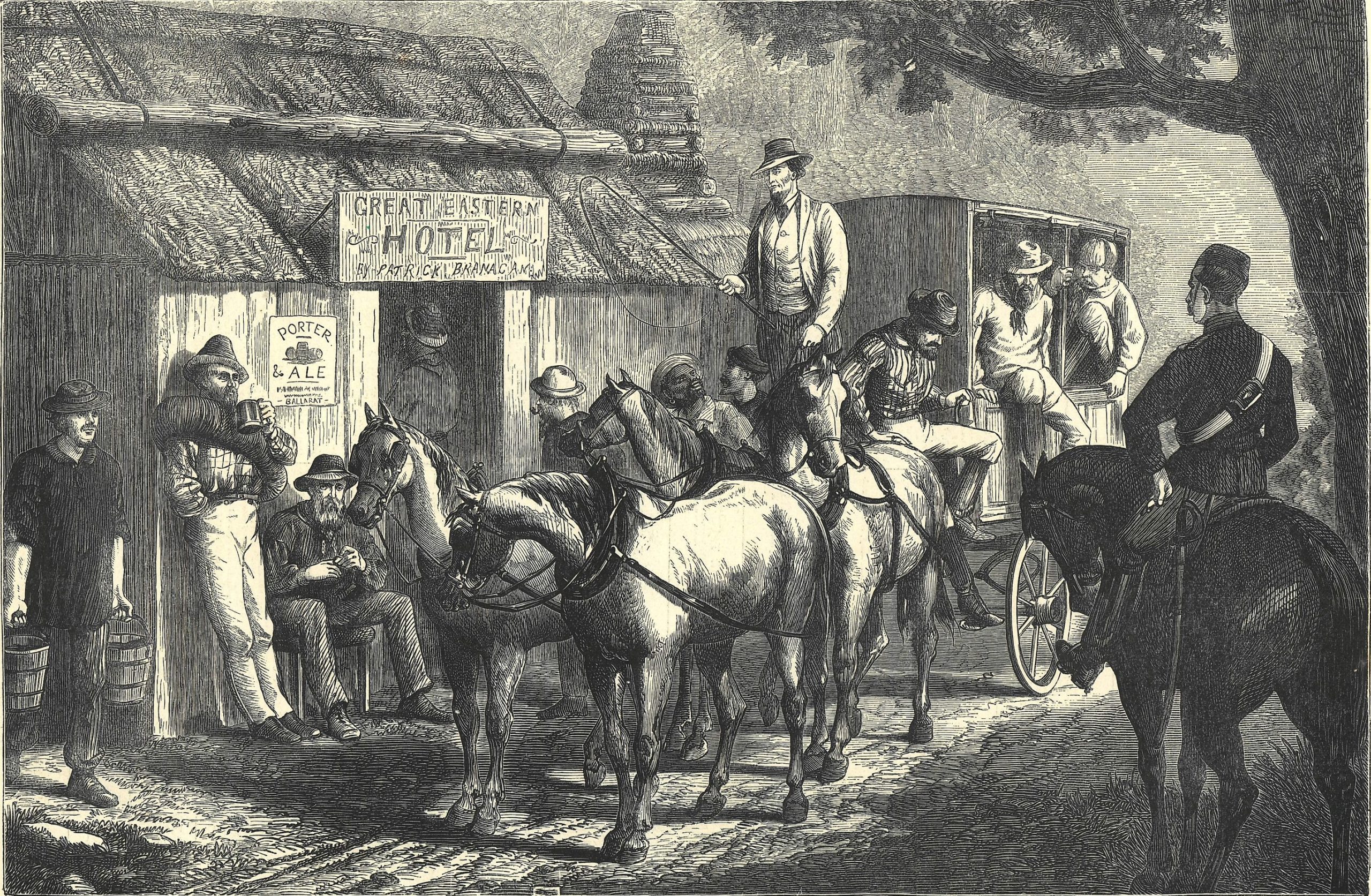 The image depicts the Grand Eastern Hotel that was located on the road between St. Kilda and Melbourne, Australia during the Victorian era.