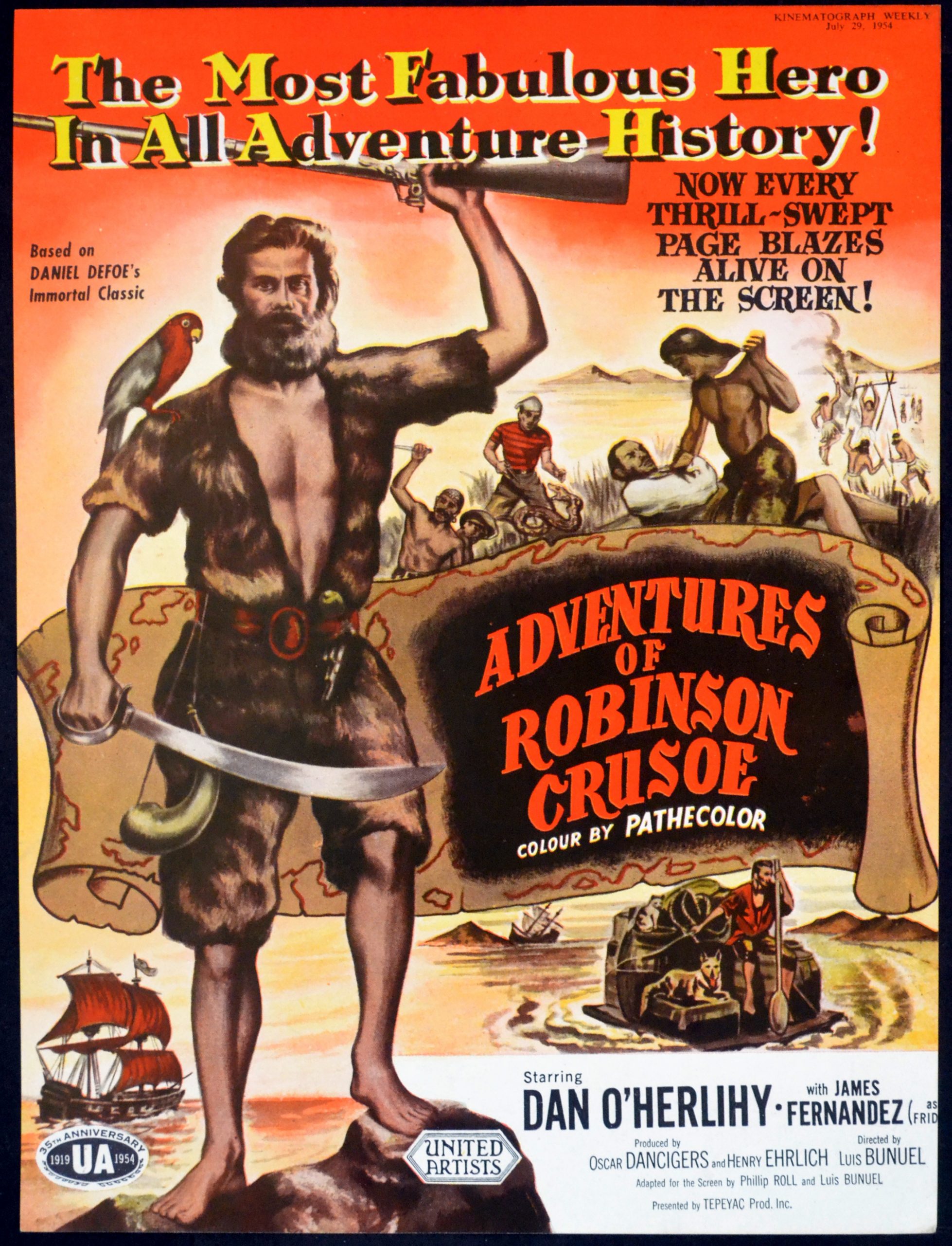 Original British 11 inch x 8 1/2 inch Trade Advertisement from Kinematograph Weekly for the 1954 Luis Bunuel Adventure THE ADVENTURES OF ROBINSON CRUSOE, based on the famous novel by Daniel Defoe and starring Dan O’Herlihy, James Fernandez, Felipe de Alba, Chel Lopez and Jose Chavez.