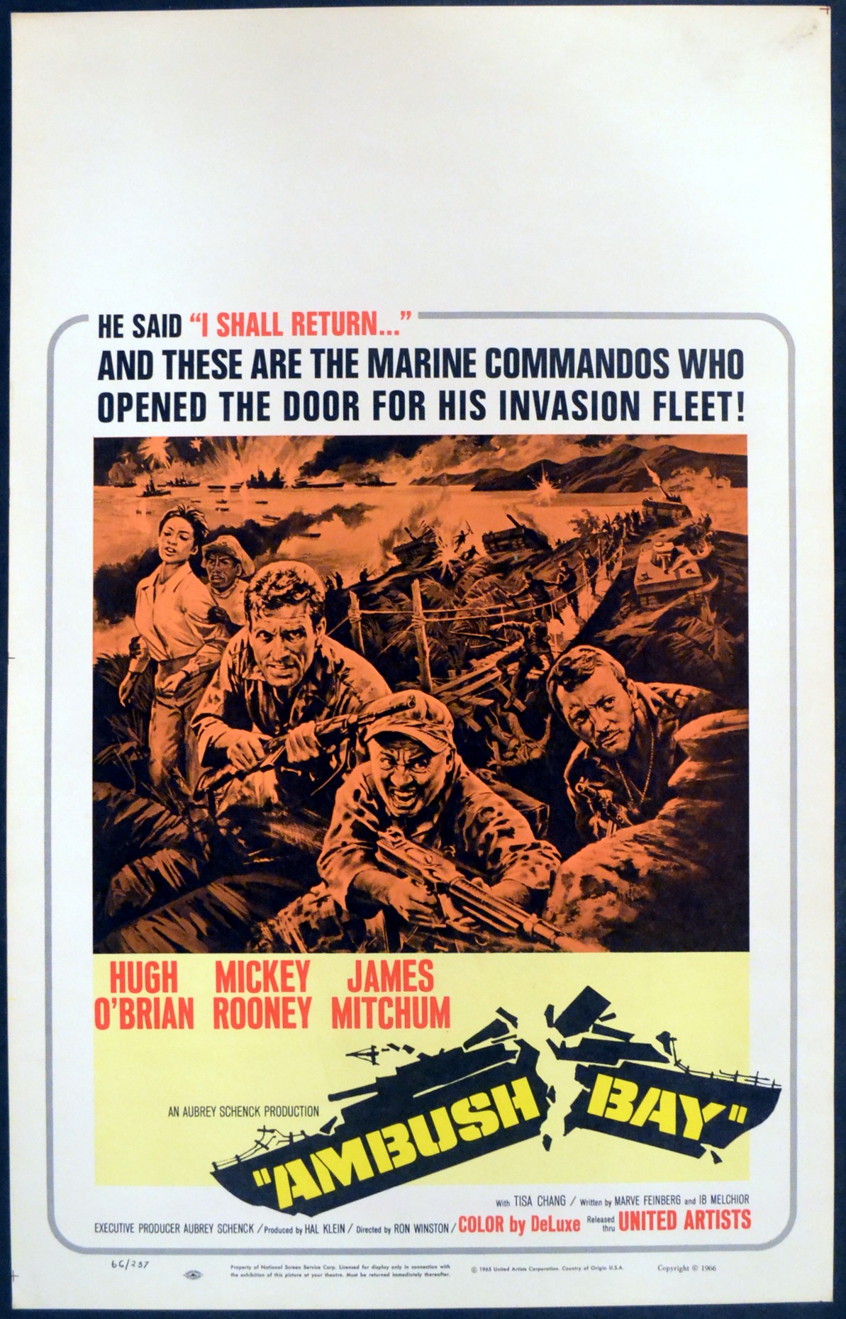 Original U.S. 14 inch x 22 inch Window Card for the 1966 Ron Winston War Movie AMBUSH BAY starring Hugh O’Brian, Mickey Rooney, James Mitchum, Greg Amsterdam, Peter Masterson, Tisa Chang and Harry Lauter.
