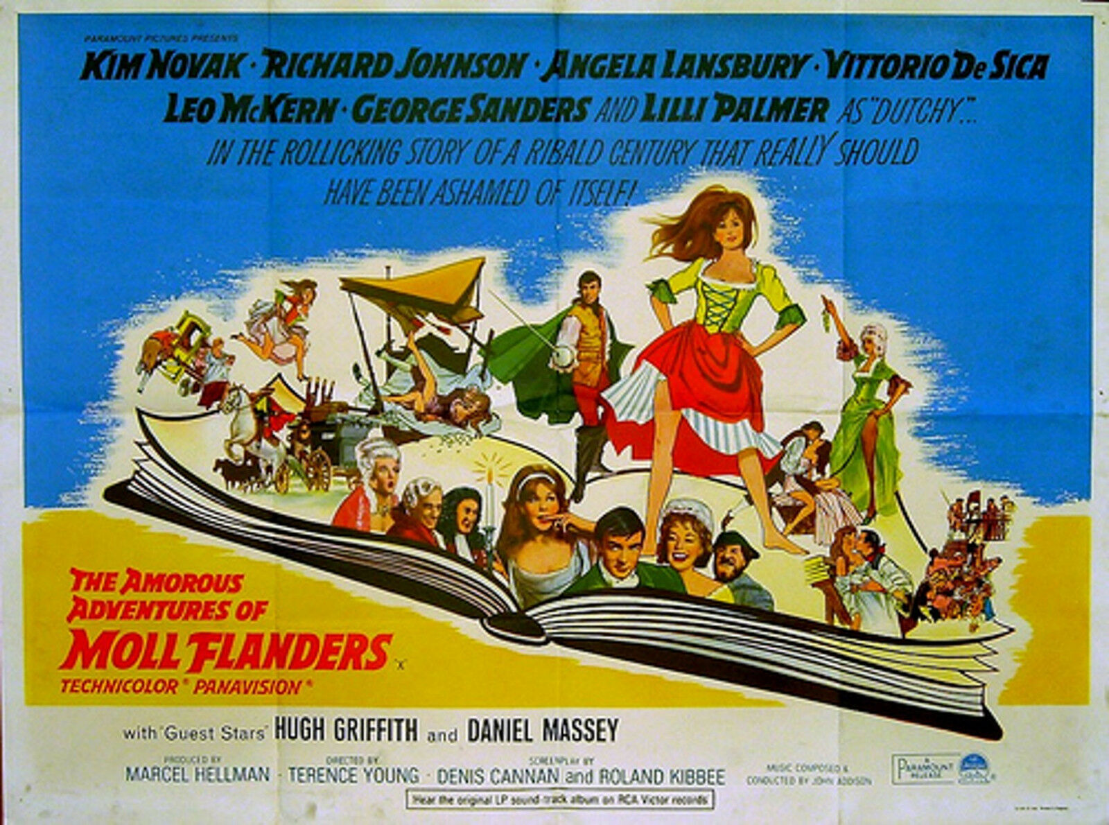 Original British 30 inch x 40 inch Quad Poster for the 1965 Terence Young Romantic Comedy THE AMOROUS ADVENTURES OF MOLL FLANDERS, based on the novel by Daniel Defoe and starring Kim Novak, Richard Johnson, Angela Lansbury, Leo McKern, Vittorio De Sica, George Sanders, Lilli Palmer, Peter Butterworth and Cecil Parker.