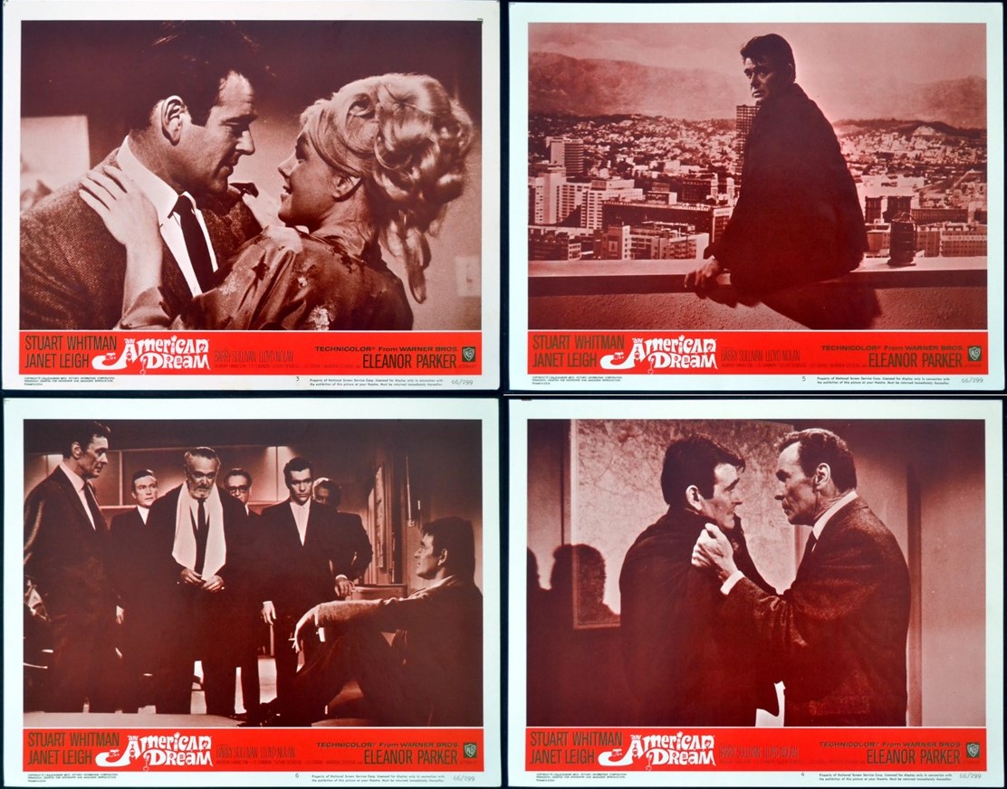 4 Original 11 inch x 14 inch U.S. Lobby Cards for the 1966 Robert Gist Thriller AN AMERICAN DREAM, based on novel byNorman Mailer and starring Stuart Whitman, Janet Leigh, Eleanor Parker, Barry Sullivan, Lloyd Nolan, Murray Hamilton, J.D. Cannon, Susan Denberg, George Takei, Les Crane, Warren Stevens, Joe De Santis, Stacy Harris, Paul Mantee, Harold Gould, Kelly Jean Peters, Hal K. Dawson, Richard Derr, James Nolan, Jack Shea and Tony Young.