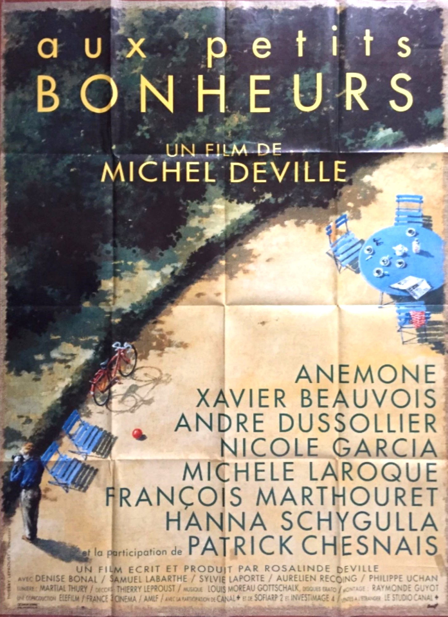 Original French 47 inch x 63 inch Poster for the 1994 Michel Deville Comedy Drama AUX PETITS BONHEURS starring Anémone, Xavier Beauvois, André Dussollier, Nicole Garcia and Hanna Schygulla.