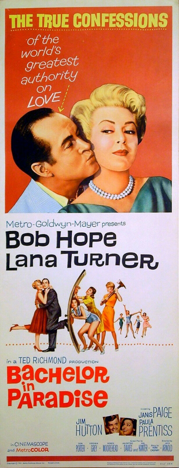 Original U.S. 14 inch x 36 inch Insert Poster for the 1961 Jack Arnold Romantic Comedy BACHELOR IN PARADISE, based on a story by Vera Caspary and starring Bob Hope, Lana Turner, Janis Paige, Jim Hutton, Paula Prentiss, Don Porter, Virginia Grey, Agnes Moorehead, Hal Kanter and Valentine Davies.