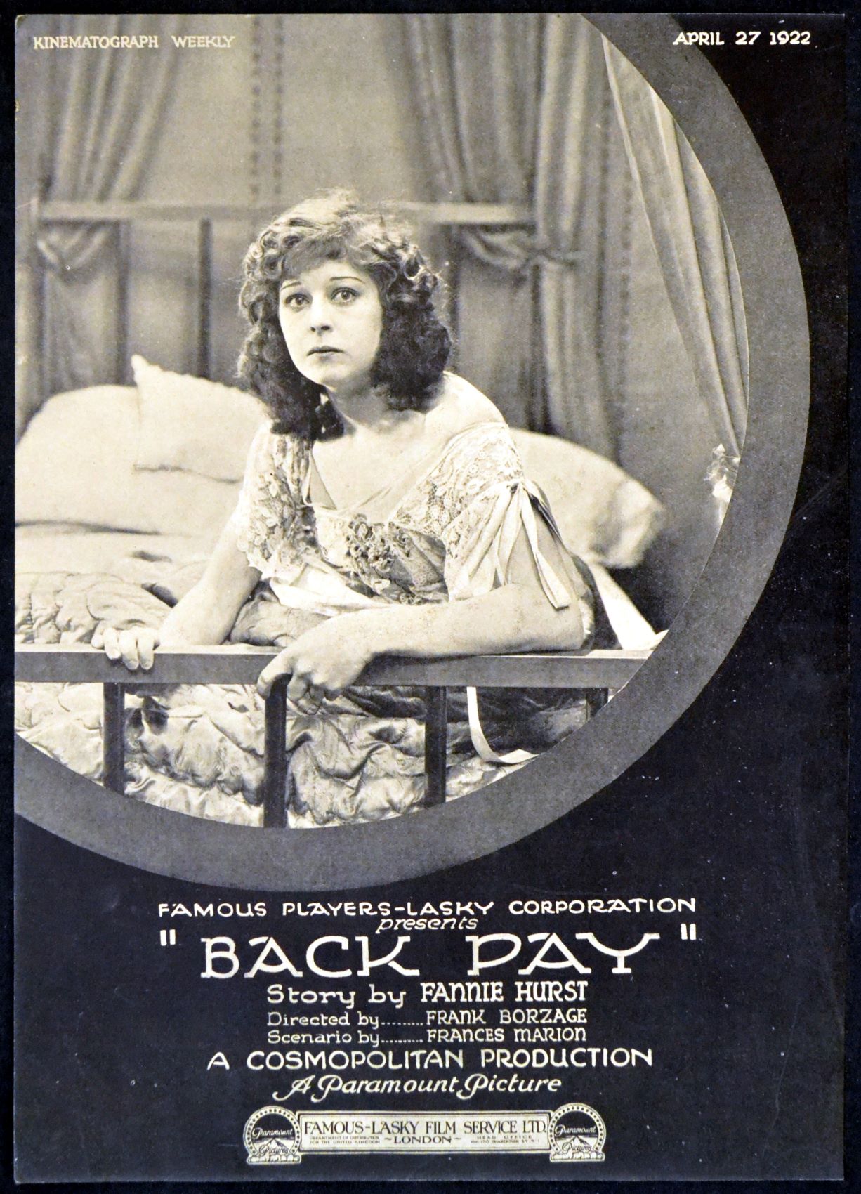 Original British 12 inch x 8 1/2 inch Trade Advertisement from Kinematograph Weekly for the 1922 Frank Borzage Drama BACK PAY, based on the novel by Fannie Hurst, produced by William Randolph Hearst and starring Seena Owen, Matt Moore, J. Barney Sherry, Ethel Duray, Charles Craig and Jerry Sinclair.