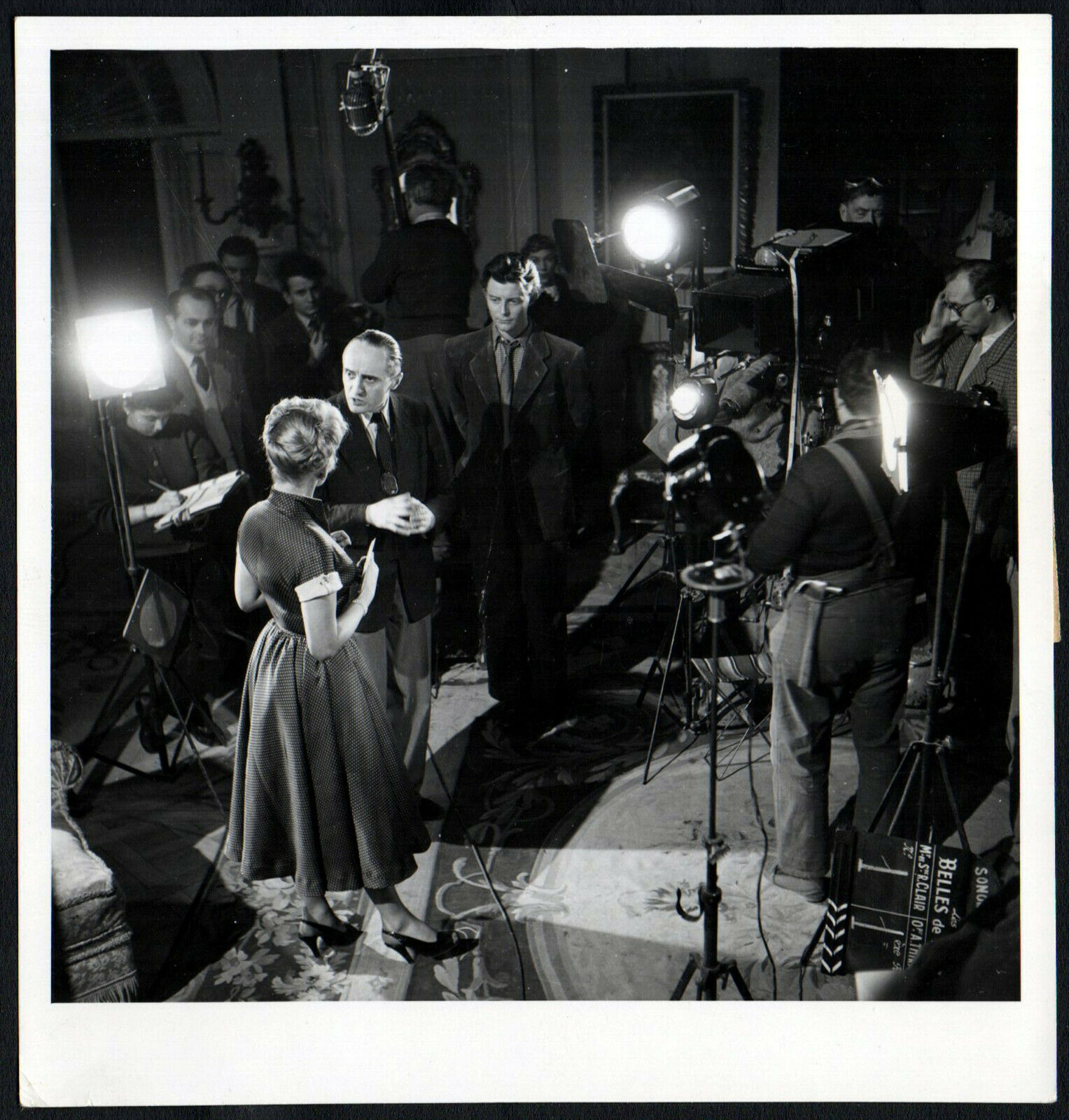 Original French 5 inch x 4 3/4 inch Still of director RENE CLAIR, GERARD PHILIPE, MARTINE CAROL and camera crew rehearsing a scene for the 1952 Fantasy BEAUTIES OF THE NIGHT (LES BELLES DE NUIT).