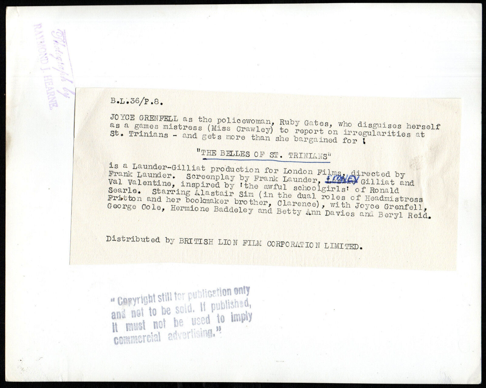 Original 10 inch x 8 inch Portrait of JOYCE GRENFELL as Ruby Gates in the 1954 Frank Launder Comedy THE BELLES OF ST. TRINIAN’S .