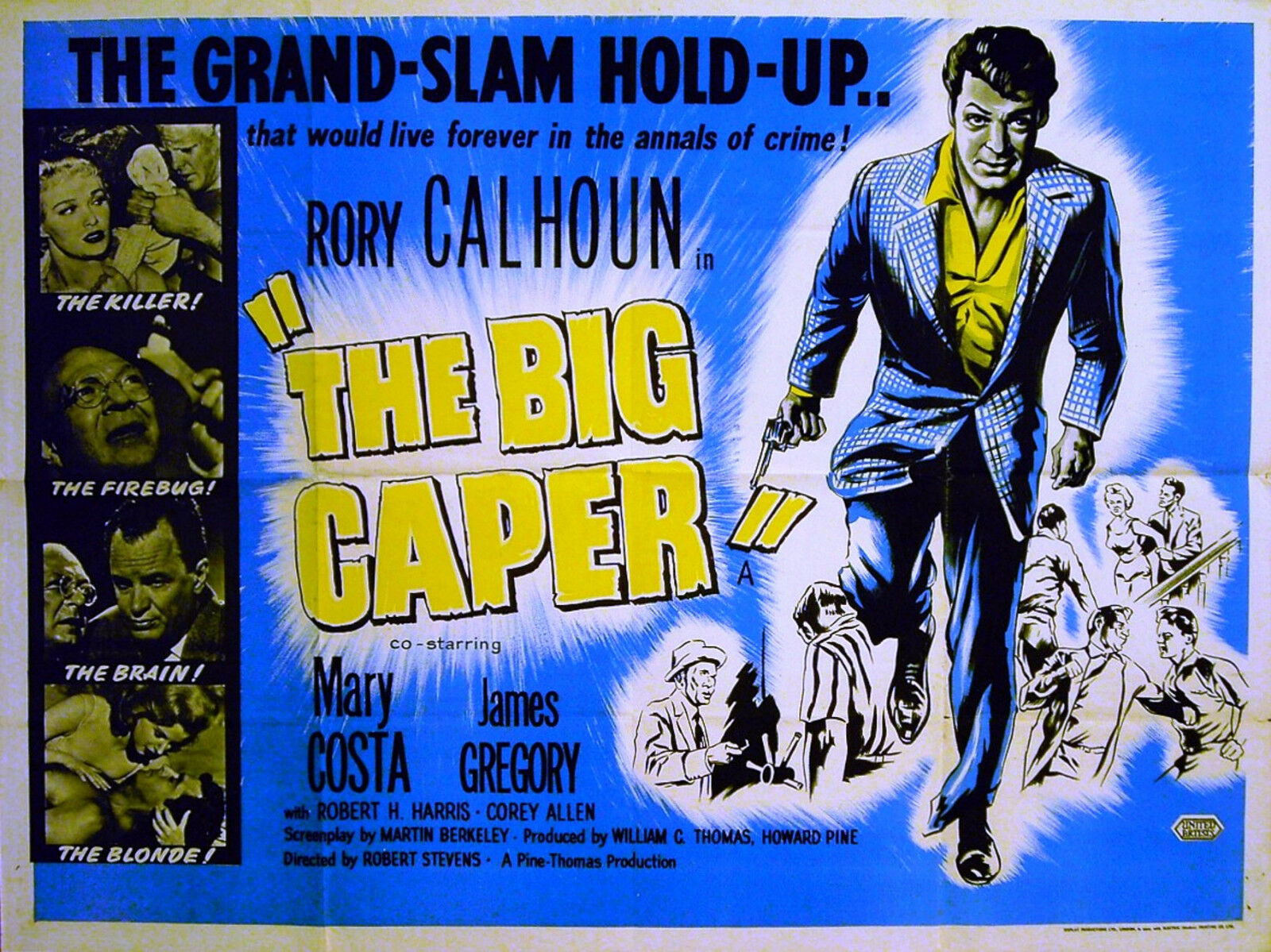 Original British 30 inch x 40 inch Quad Poster for the 1957 Robert Stevens Crime Drama THE BIG CAPER starring Rory Calhoun, Mary Costa, James Gregory, Robert H. Harris, Corey Allen and Roxanne Arlen.
