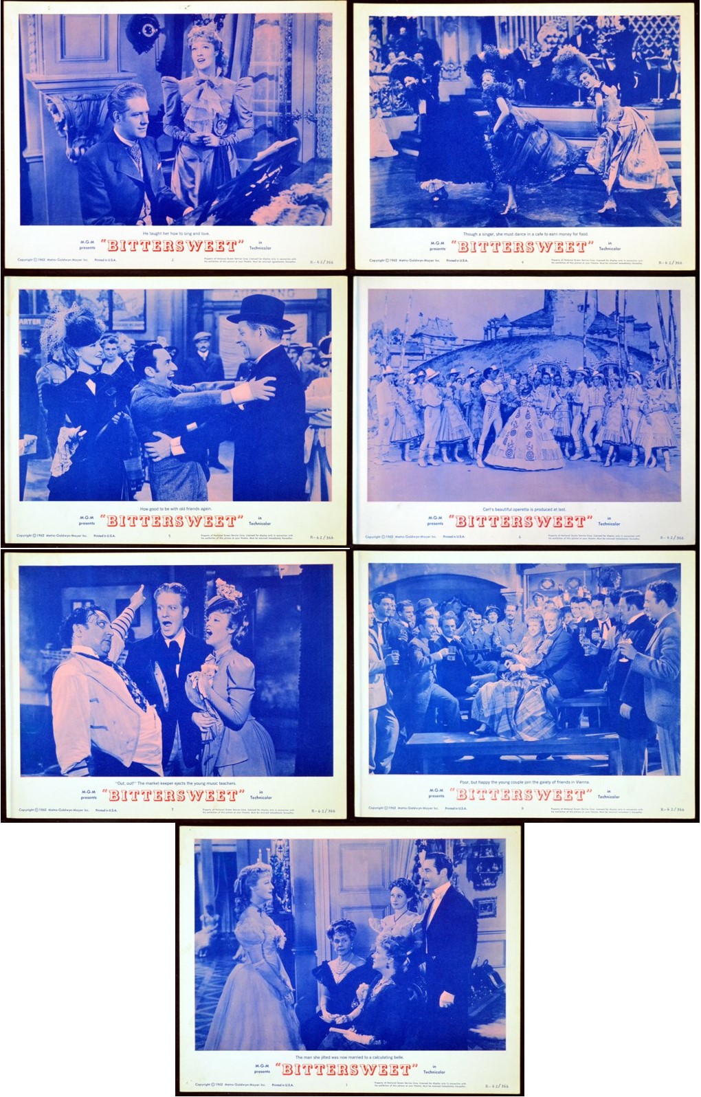 7 Original 1962 Re-Release 11 inch x 14 inch U.S. Lobby Cards for the 1940 W.S. Van Dyke Musical Drama BITTERSWEET, based on the play by Noël Coward and starring Jeanette MacDonald, Nelson Eddy, George Sanders, Ian Hunter, Felix Bressart, Edward Ashley, Lynne Carver, Fay Holden, Sig Ruman, Veda Ann Borg, Herman Bing and King Baggot.