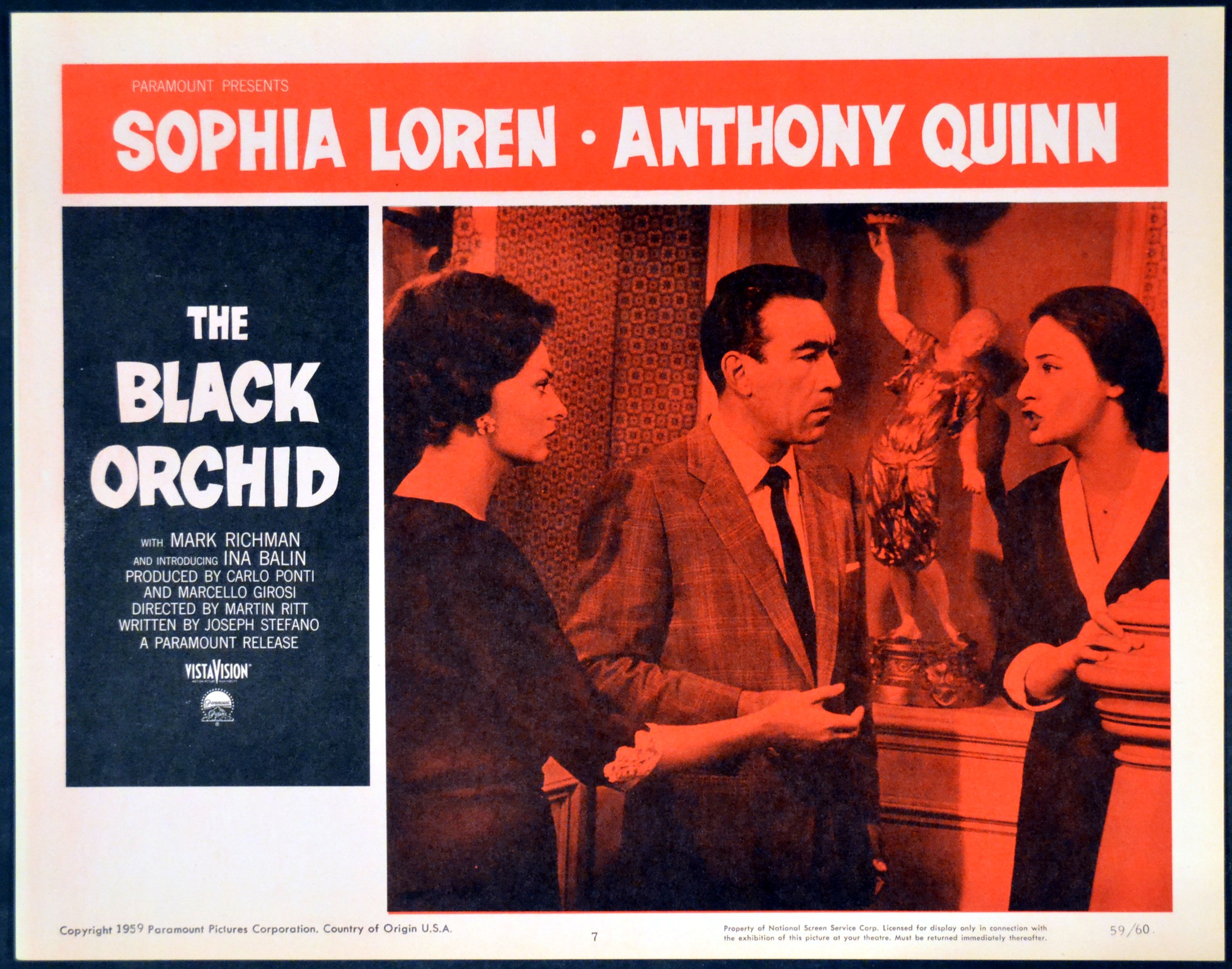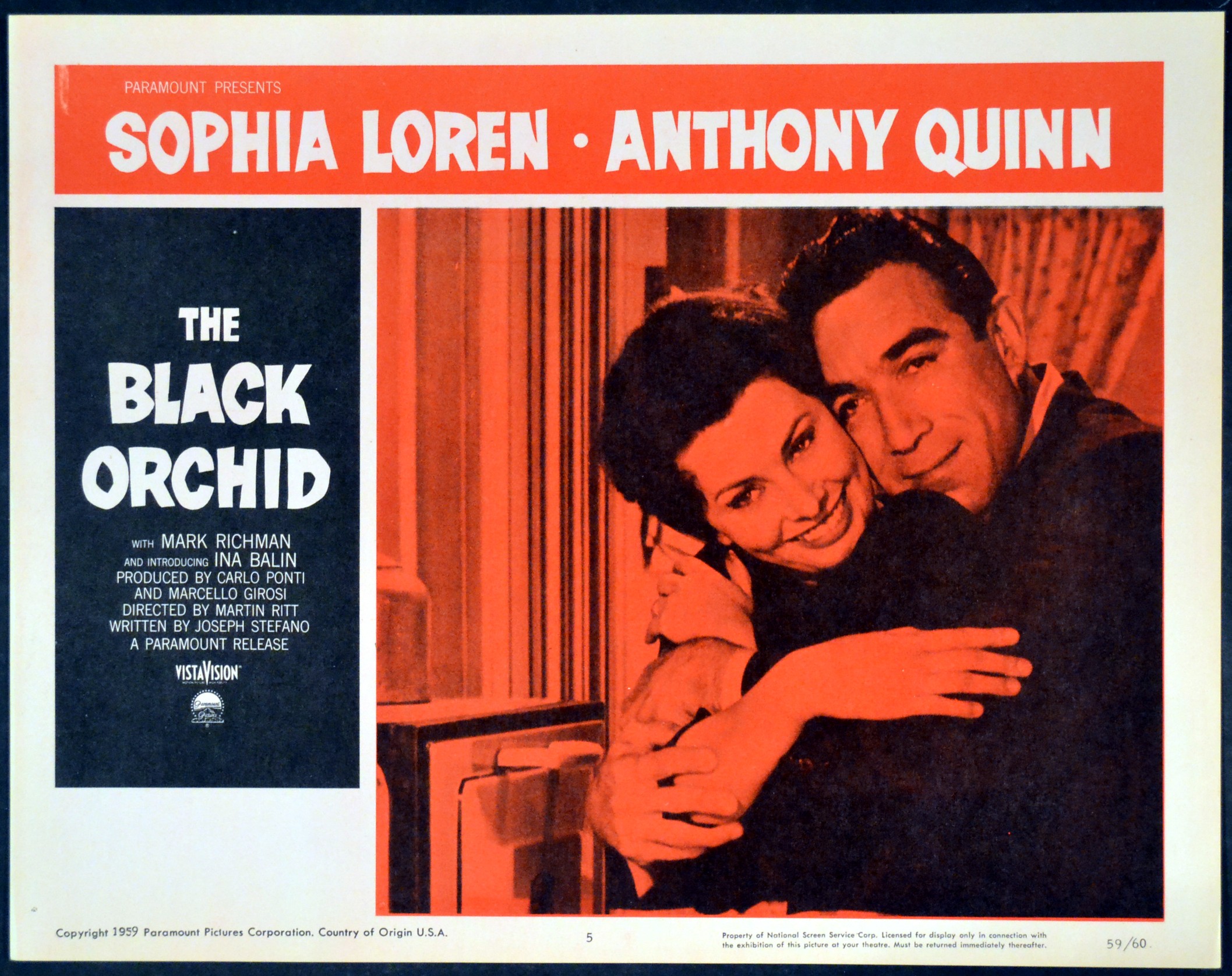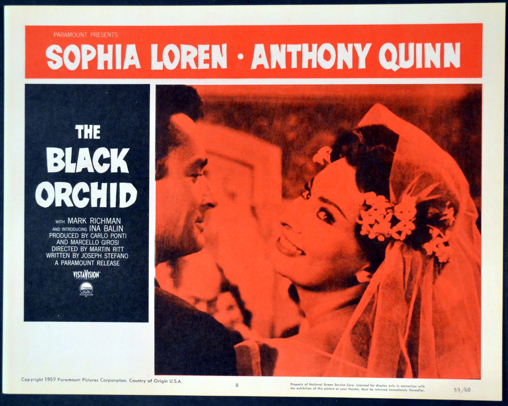 3 Original U.S. 11 inch by 14 inch Lobby Cards for the 1958 Martin Ritt Drama THE BLACK ORCHID, written by Joseph Stefano and starring Sophia Loren, Anthony Quinn and Ina Balin.