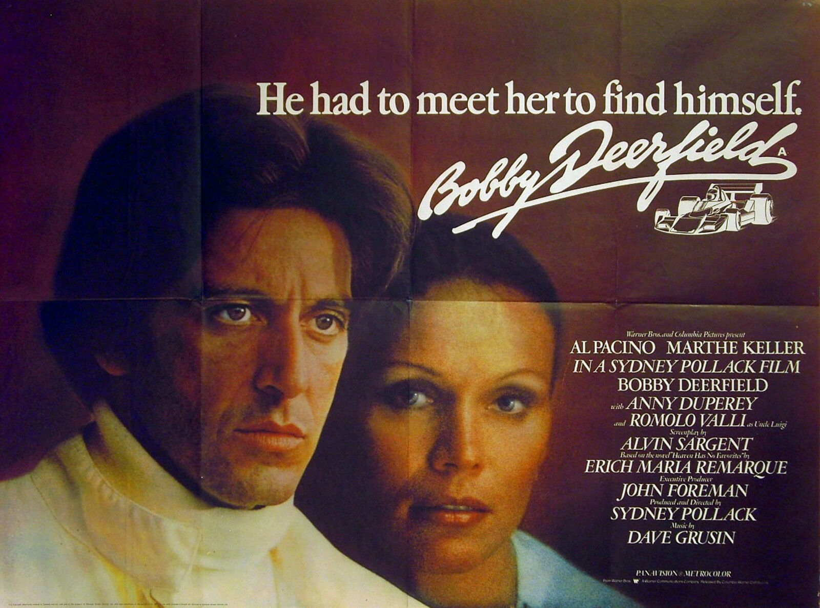Original British 30 inch x 40 inch Quad Poster for the 1977 Sydney Pollack Motor Racing Drama BOBBY DEERFIELD, based on a novel by Erich Maria Remarque and starring Al Pacino as a Grand Prix racing driver and Marthe Keller.