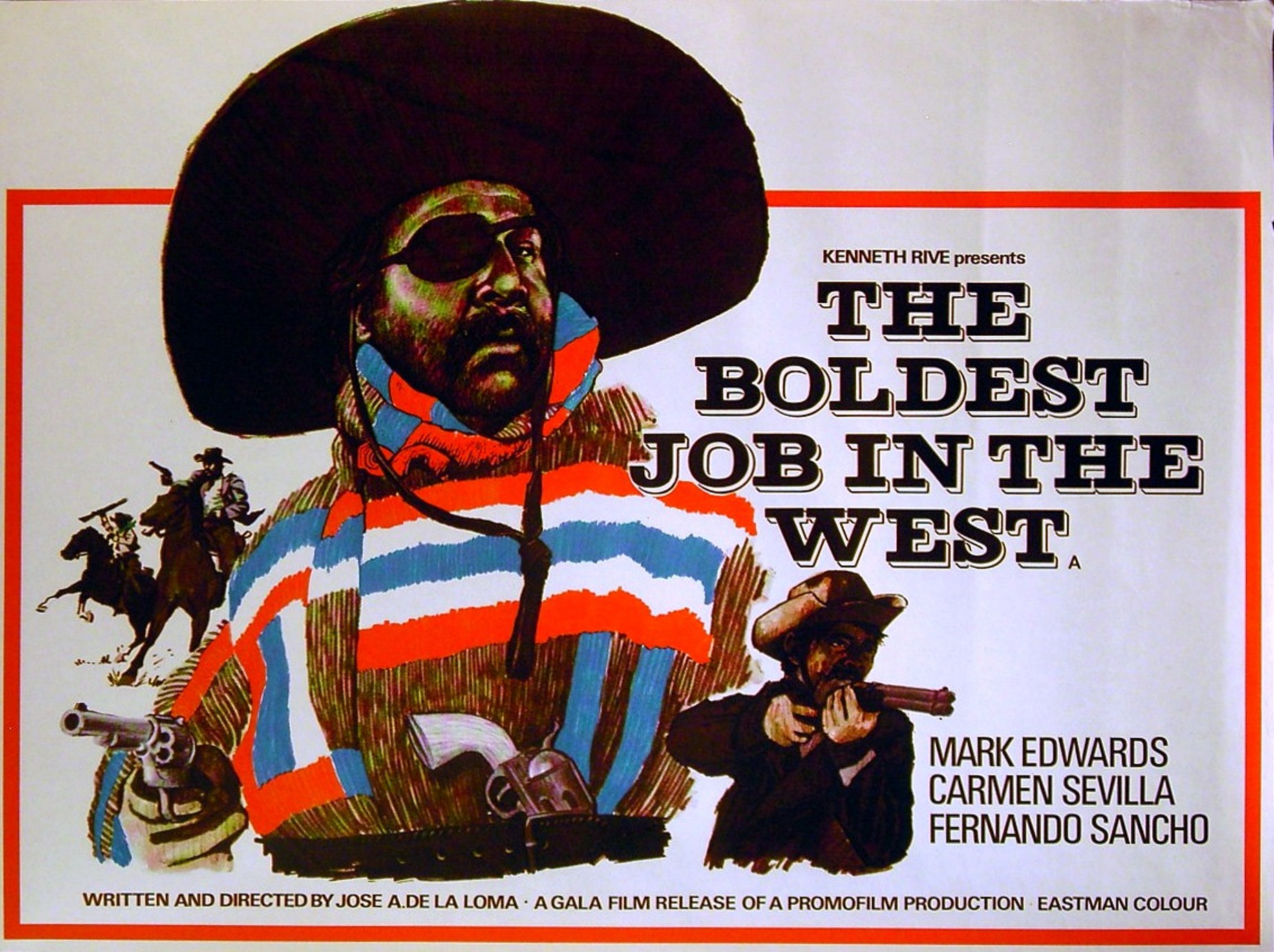 Original British 30 inch x 40 inch Quad Poster for the 1972 José Antonio de la Loma Spaghetti Western THE BOLDEST JOB IN THE WEST (EL MAS FABULOSO GOLPE DEL FAR-WEST) starring Fernando Sancho, Charly Bravo, Mark Edwards, Piero Lulli, Carmen Sevilla, Frank Brana, Fernando Bilbao.