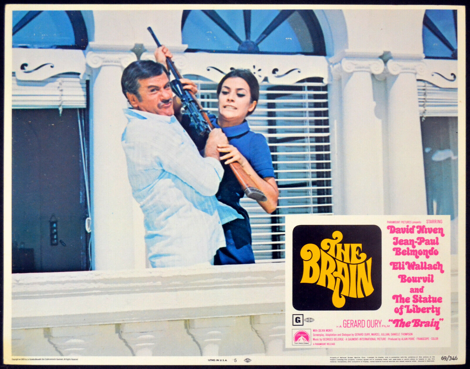 Original 11 inch x 14 inch U.S. Lobby Card #5 for the 1969 Gérard Oury Comedy THE BRAIN starring Jean-Paul Belmondo, Bourvil, David Niven, Eli Wallach, Silvia Monti, Raymond Gérôme, Jacques Balutin, Yves Barsacq, Jacques Ciron, Robert Dalban, Mario David and Henri Attal.