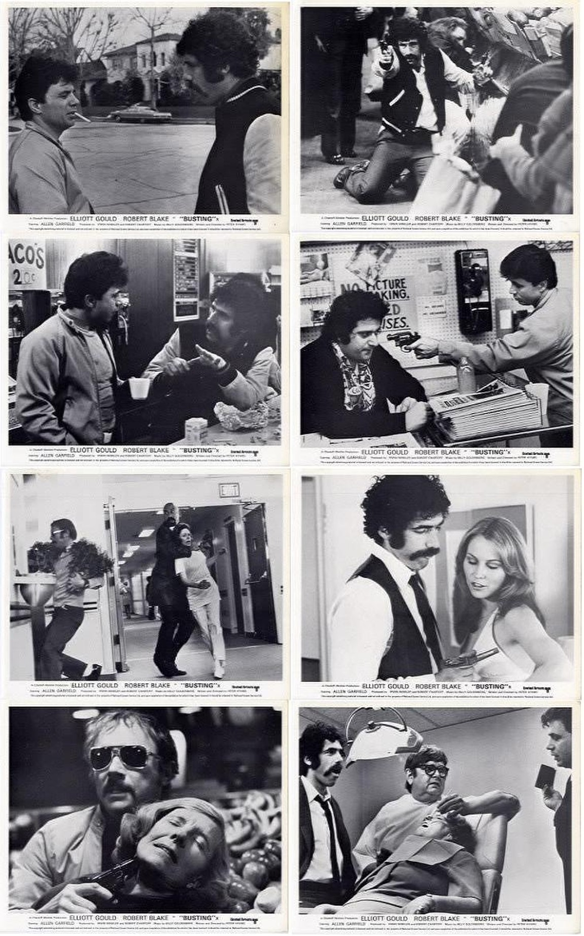 Original British 10 inch by 8 inch Set of 8 Front-of-House Stills (Lobby Cards) for the 1973 Peter Hyams Thriller BUSTING starring Elliott Gould, Robert Blake, Allen Garfield, Antonio Fargas and Michael Lerner.