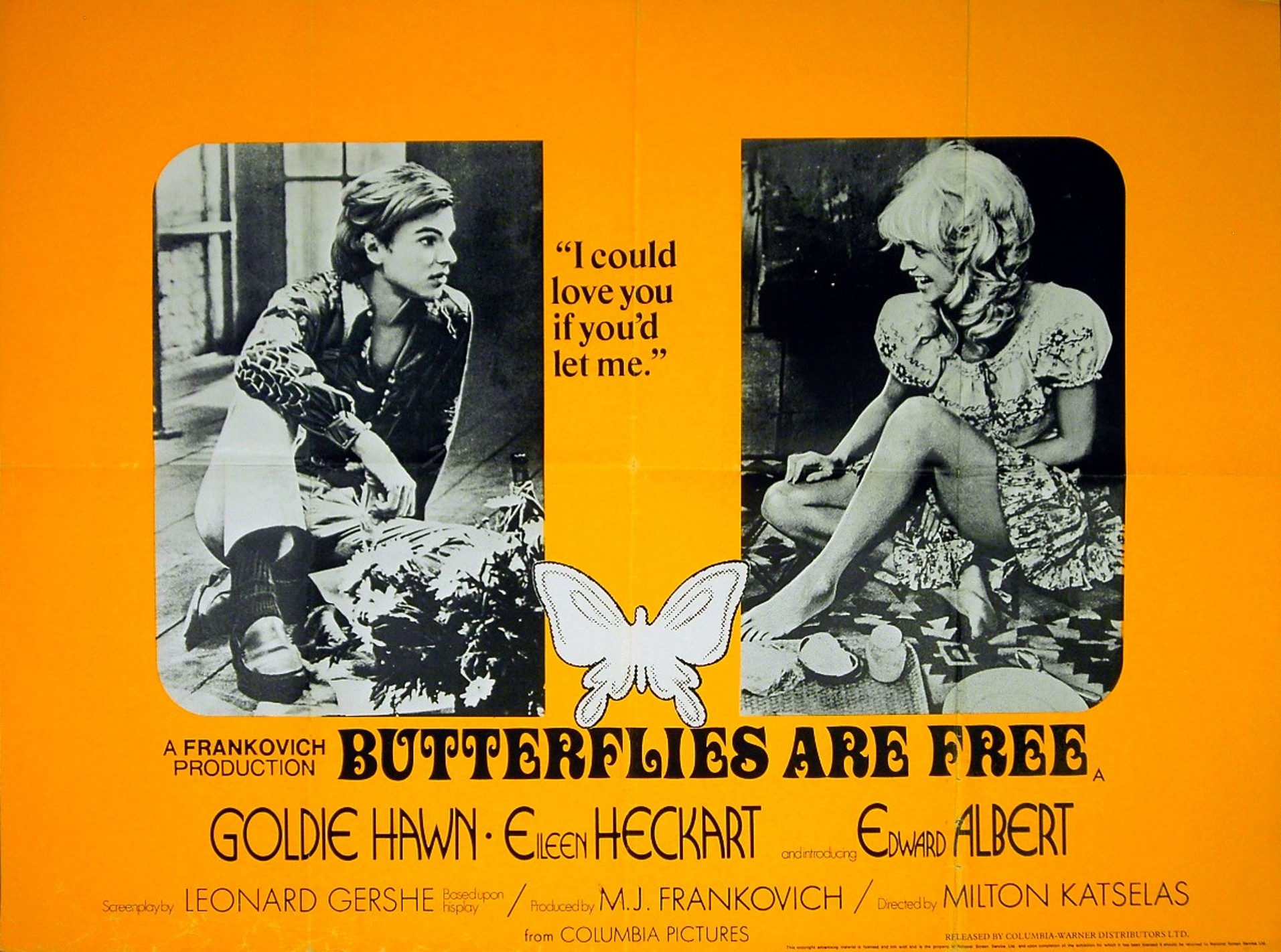 Original British 30 inch x 40 inch Quad Poster for the 1972 Milton Katselas Romantic Comedy BUTTERFLIES ARE FREE, based on the play by Leonard Gershe and starring Goldie Hawn, Edward Albert, Eileen Heckart, Paul Michael Glaser and Michael Warren.