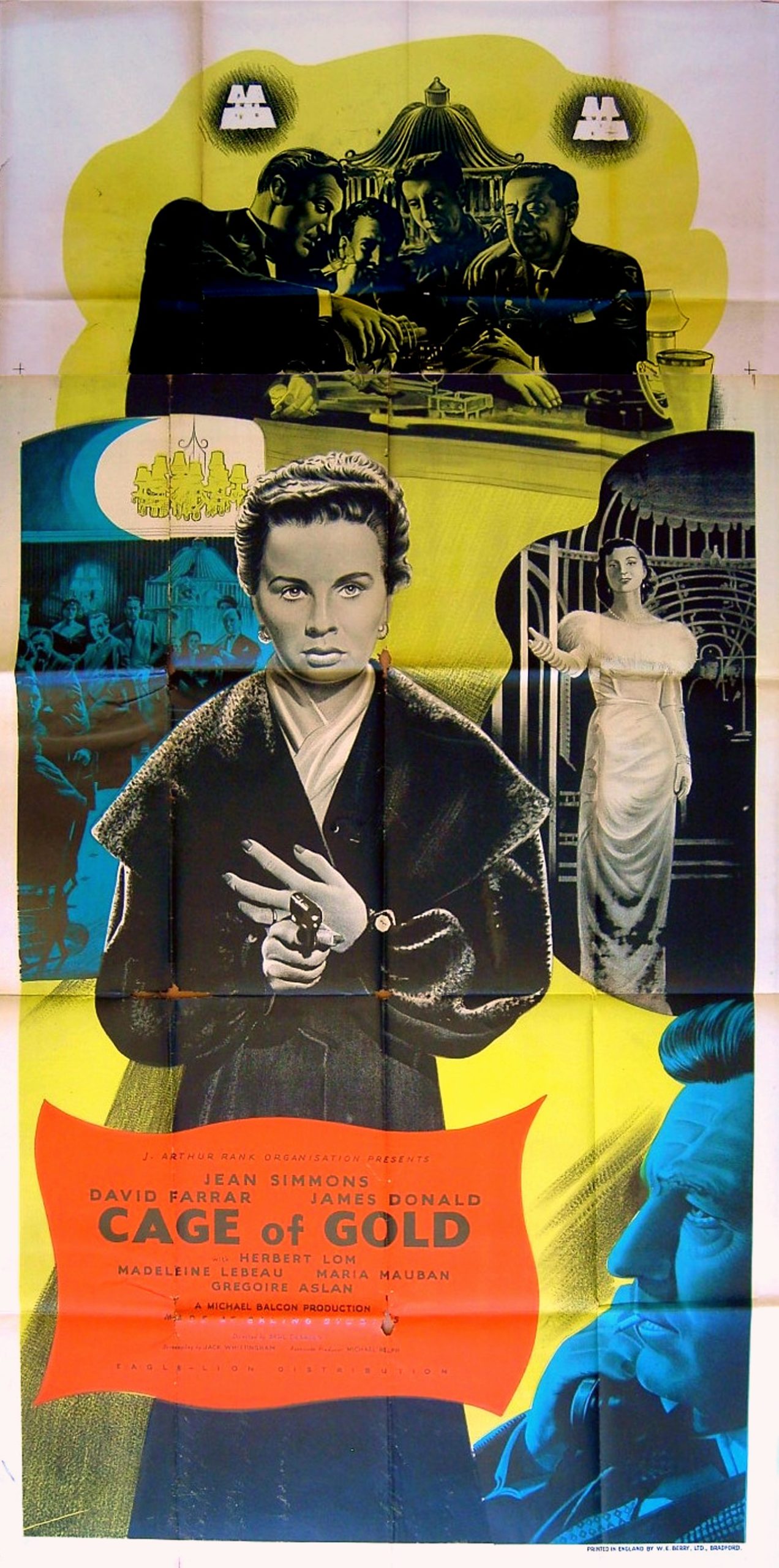 Original British 40 inch x 81 inch 3-Sheet Poster for the 1950 Basil Dearden Ealing Studios Crime Drama CAGE OF GOLD, from an original story by Jack Whittingham & Paul L. Stein and starring Jean Simmons, David Farrar, James Donald, Herbert Lom, Harcourt Williams, Gladys Henson, Gregoire Aslan, Madeleine Lebeau, Maria Mauban, Bernard Lee, Martin Boddey, Campbell Singer and Arthur Howard.