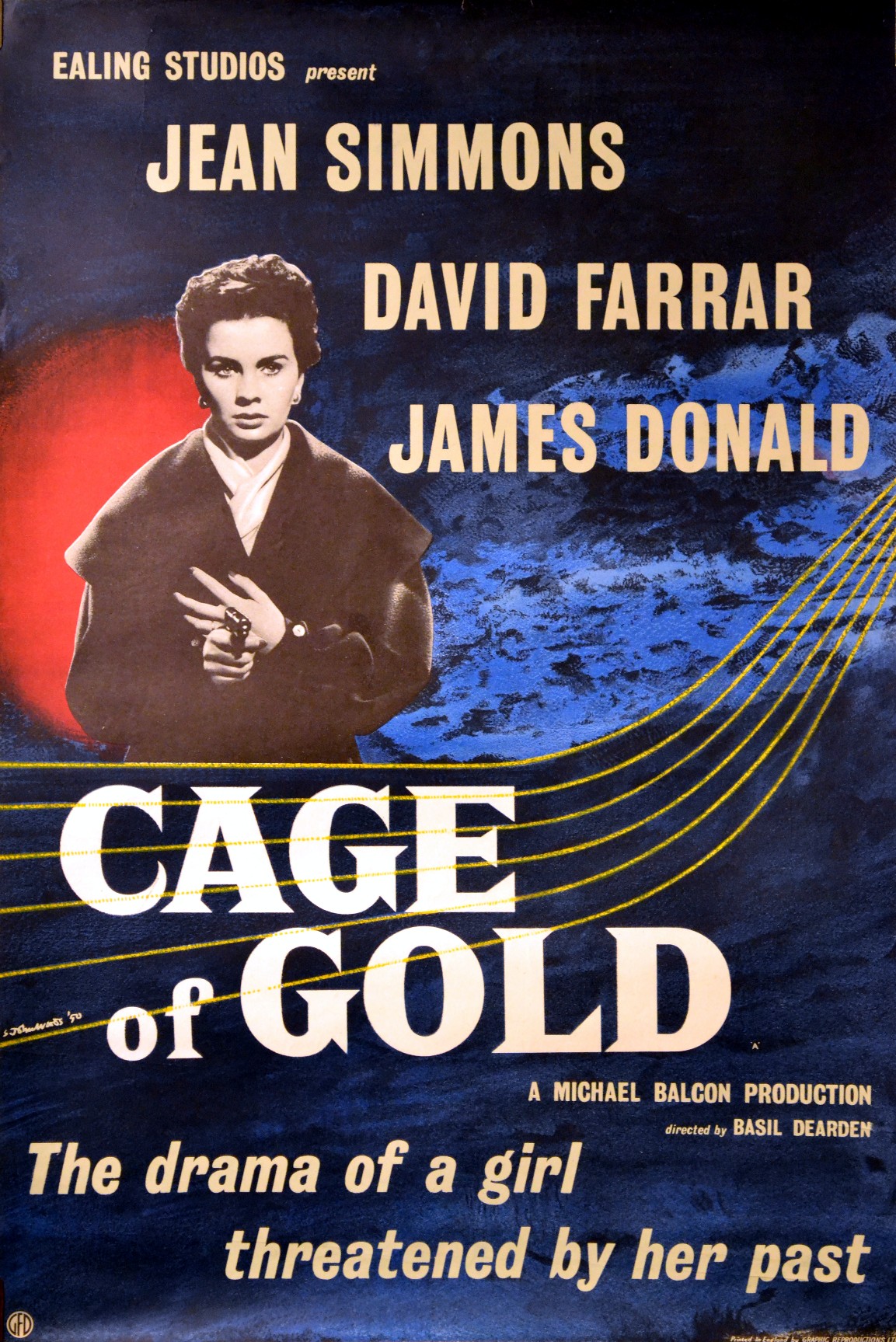 Original British 20 inch x 30 inch Double Crown Poster for the 1950 Basil Dearden Ealing Studios Crime Drama CAGE OF GOLD, from an original story by Jack Whittingham & Paul L. Stein and starring Jean Simmons, David Farrar, James Donald, Herbert Lom, Harcourt Williams, Gladys Henson, Gregoire Aslan, Madeleine Lebeau, Maria Mauban, Bernard Lee, Martin Boddey, Campbell Singer and Arthur Howard.