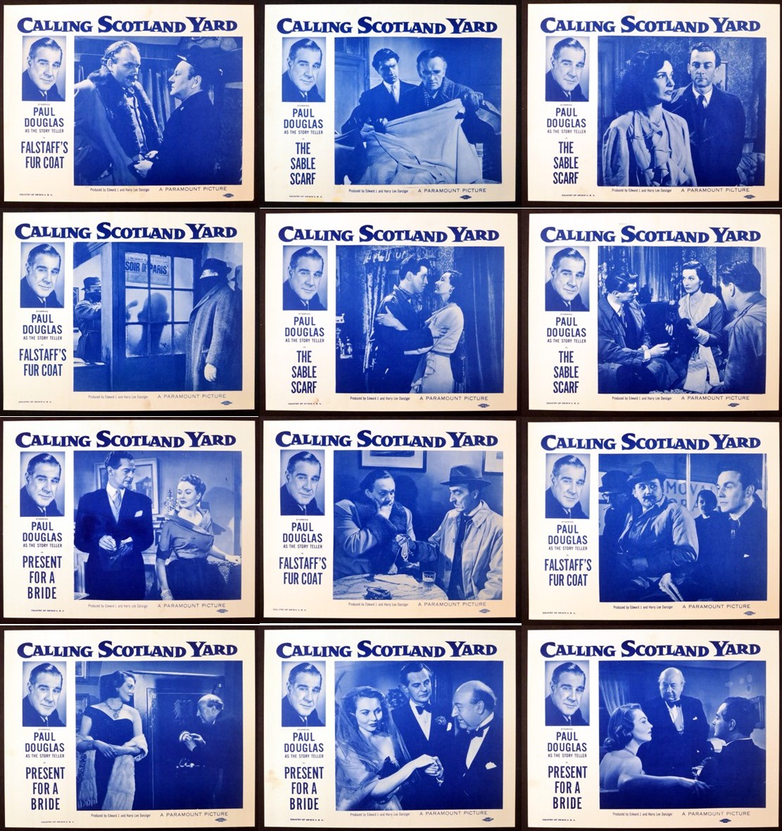 12 Original 11 inch x 14 inch U.S. Lobby Cards for the 1954 Paul Dickson Mystery CALLING SCOTLAND YARD, introduced by PAUL DOUGLAS and starring John Laurie, Hugh Latimer, Judy Campbell, Andrew Crawford, Hazel Court, Derek Bond, David Horne, Howard Marion-Crawford, Robert Adair, Pater Bathurst, Wilfrid Caithness, Harold Jamieson and Andreas Malandrinos.