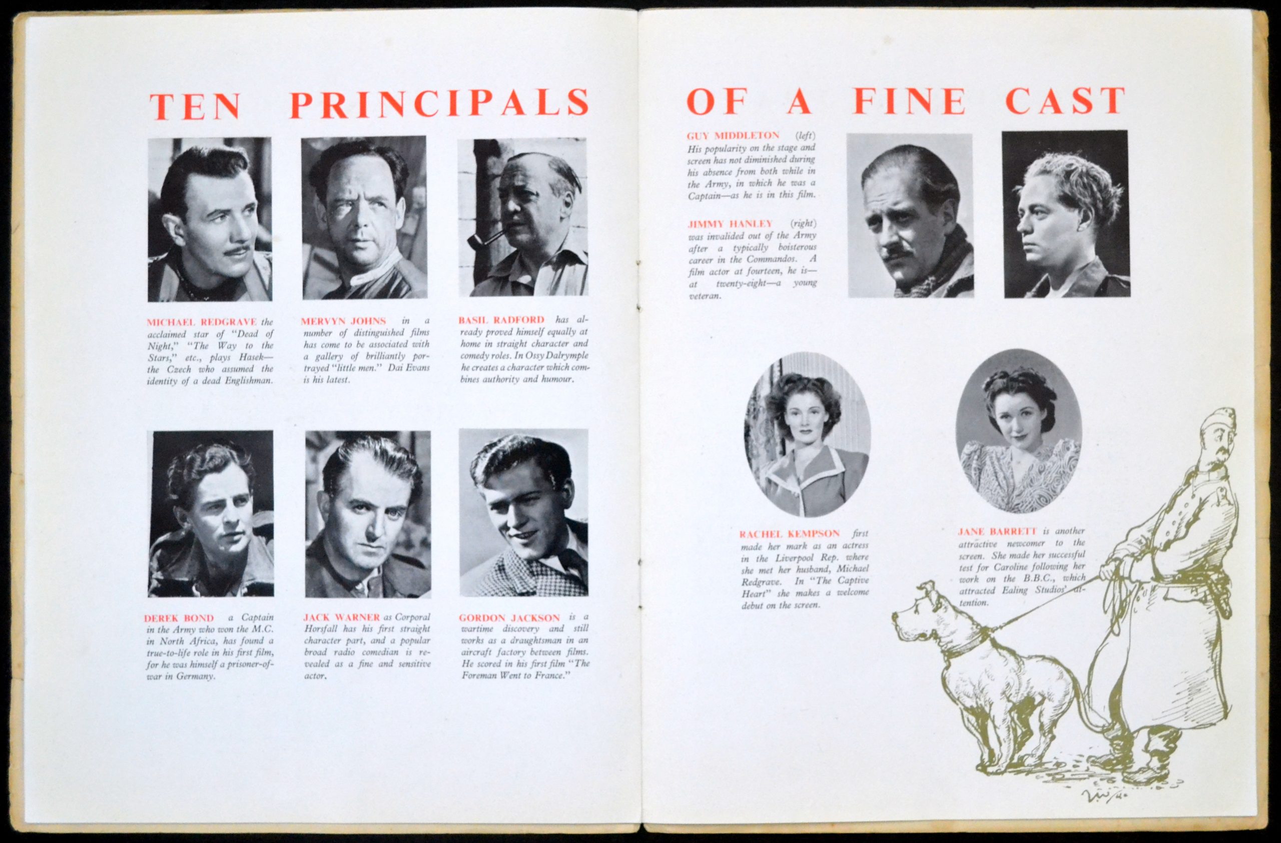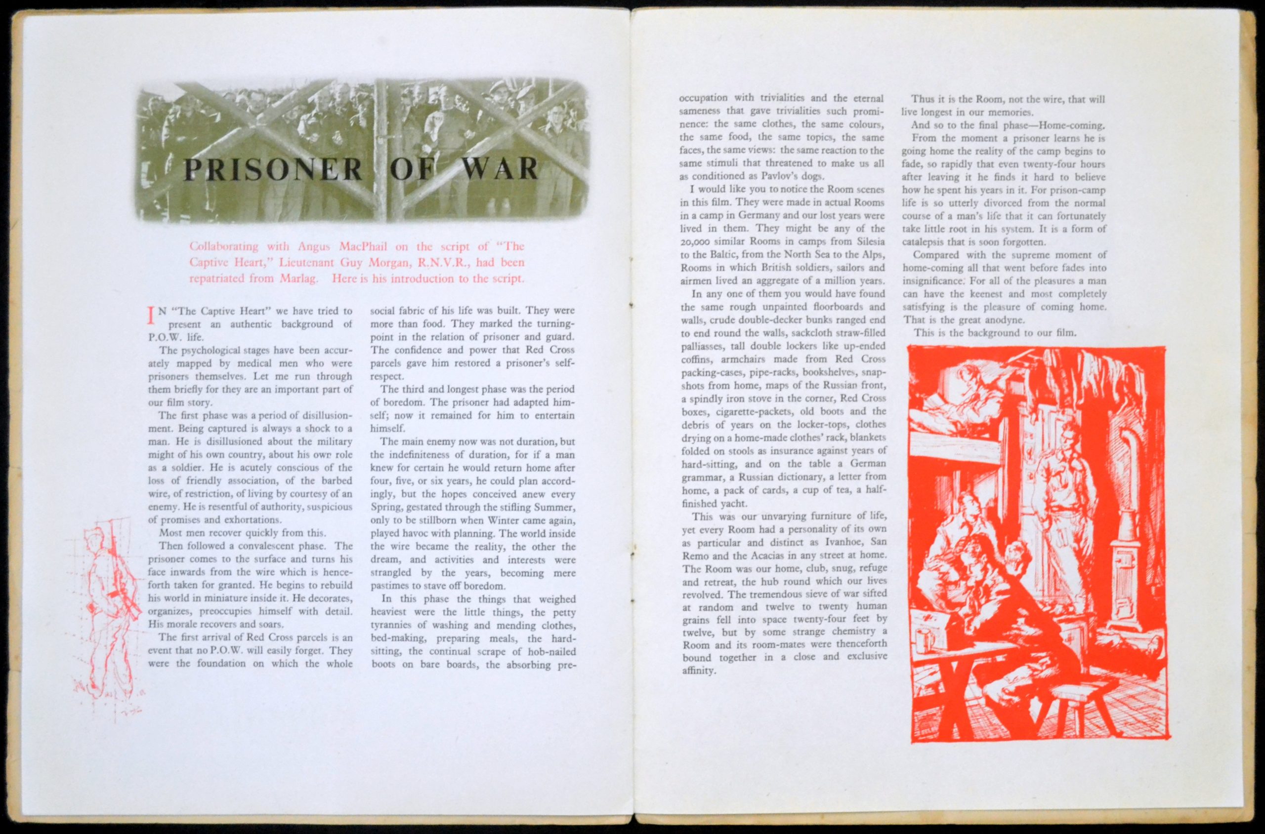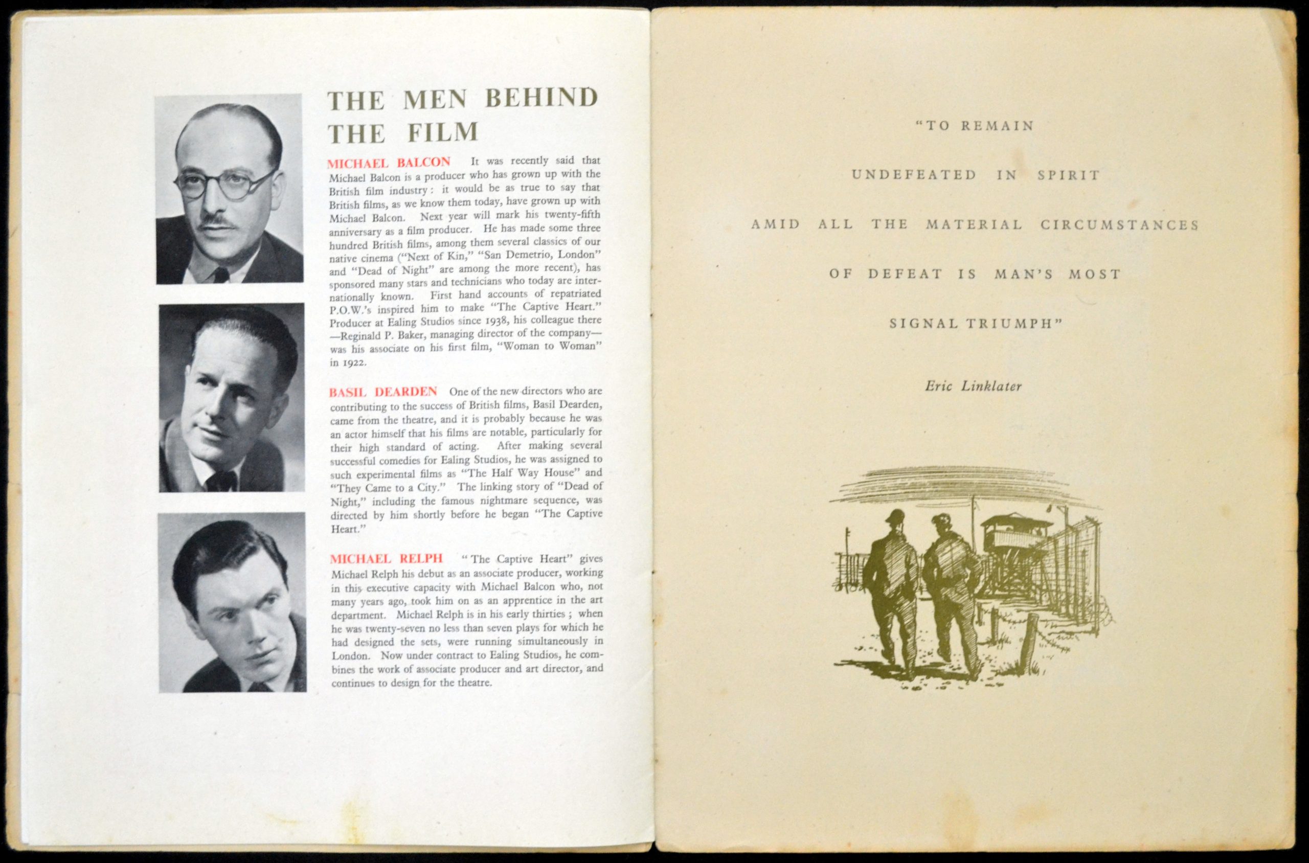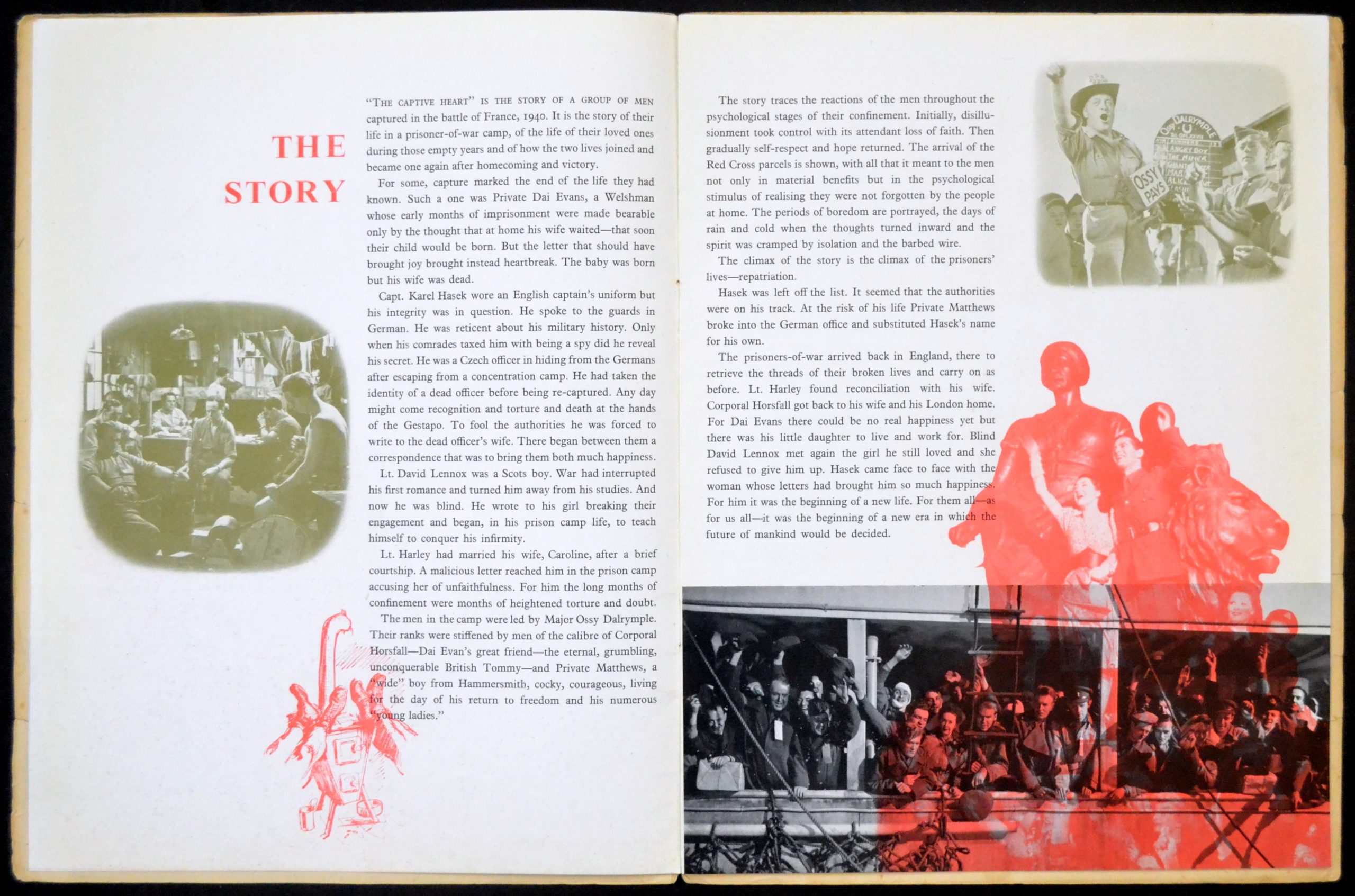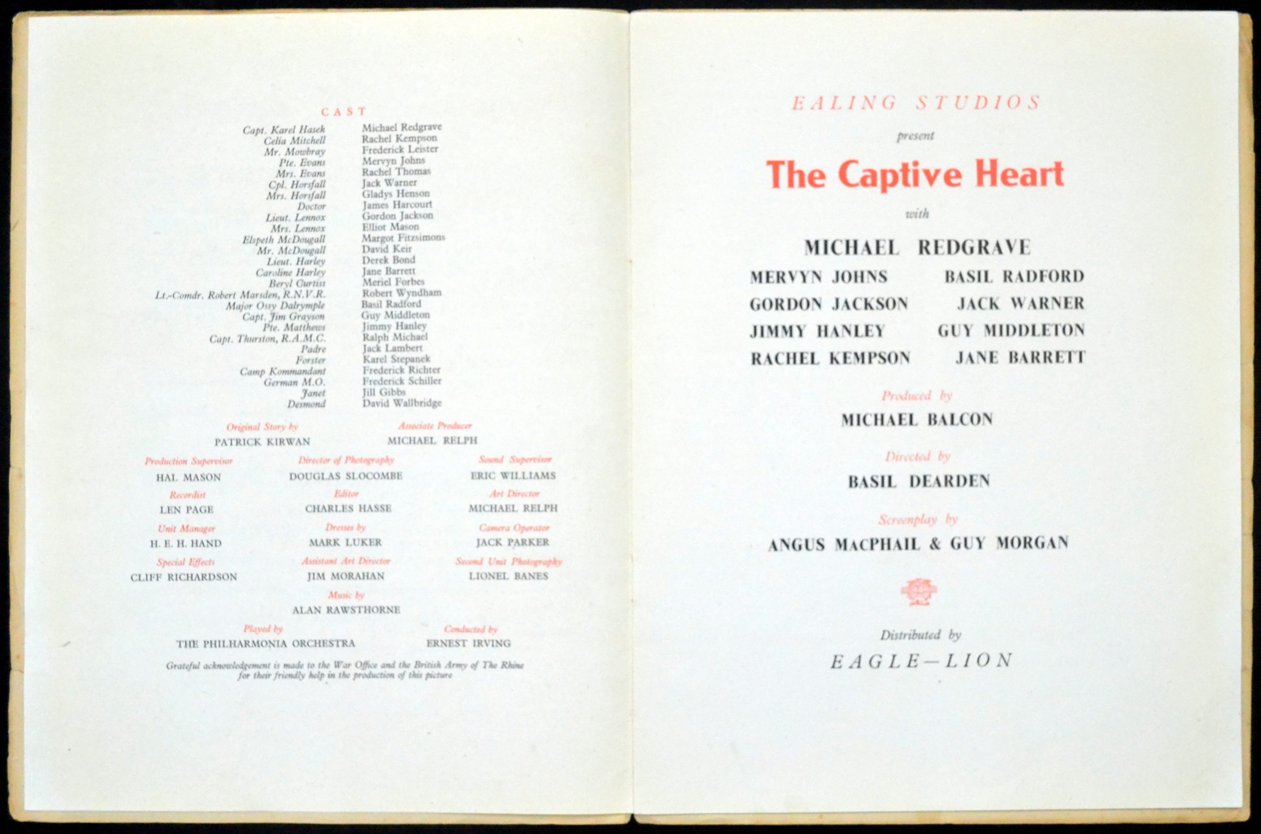 Original British 11 1/4 inch x 8 1/2 inch illustrated 16 page Brochure for the 1946 Basil Dearden Ealing Studios Priosner-of-War Drama THE CAPTIVE HEART starring Michael Redgrave, Jack Warner, Mervyn Johns, Jack Lambert, Basil Radford, Jimmy Hanley, Gordon Jackson, Ralph Michael, Derek Bond, Rachel Kempson, Guy Middleton, Gladys Henson and Karel Stepanek.
