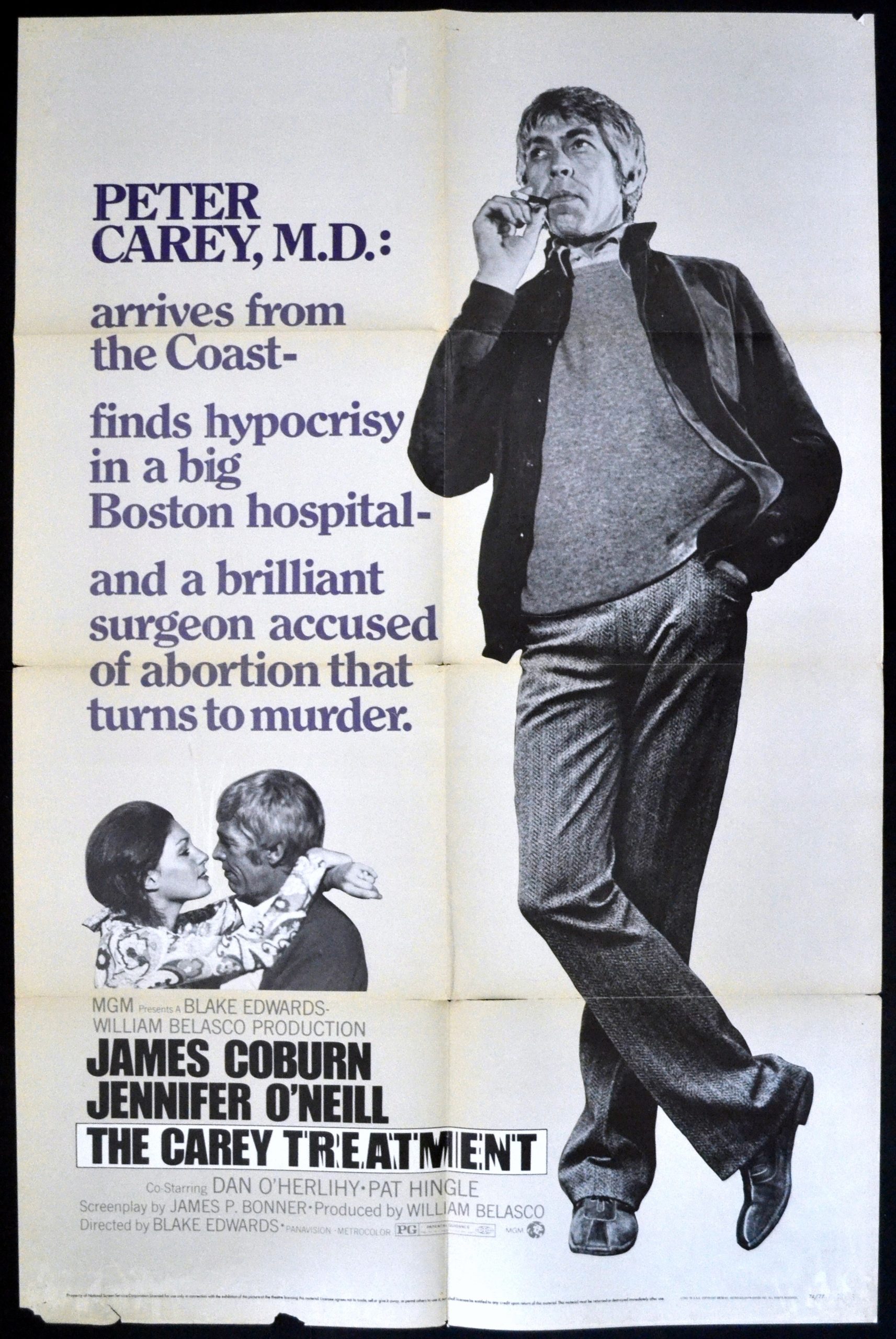 Original U.S. 27 inch x 41 inch 1-Sheet Poster for the 1972 Blake Edwards Thriller THE CAREY TREATMENT, based on the novel by Michael Crichton and starring James Coburn, Jennifer O’Neill, Dan O’Herlihy, Pat Hingle, Michael Blodgett, Charles Bleecker and Skye Aubrey.