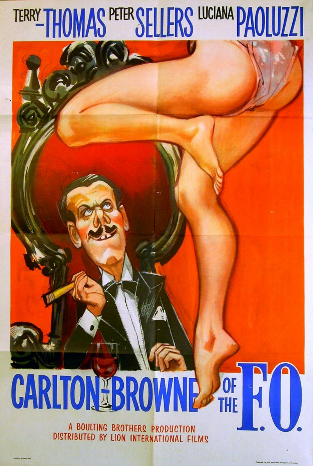 Original British 27 inch by 40 inch 1-Sheet Poster for the 1959 Roy Boulting & Jeffrey Dell Comedy CARLTON-BROWNE OF THE F.O. starring Peter Sellers, Terry-Thomas, Ian Bannen, Luciana Paluzzi, Thorley Walters, Miles Malleson, Raymond Huntley, John Le Mesurier, Marie Lohr, Kynaston Reeves, Ronald Adam, Nicholas Parsons , Irene Handl, Mario Fabrizi, Harry Locke, Basil Dignam, Sam Kydd, Marianne Stone, Kenneth Griffith and Marne Maitland.