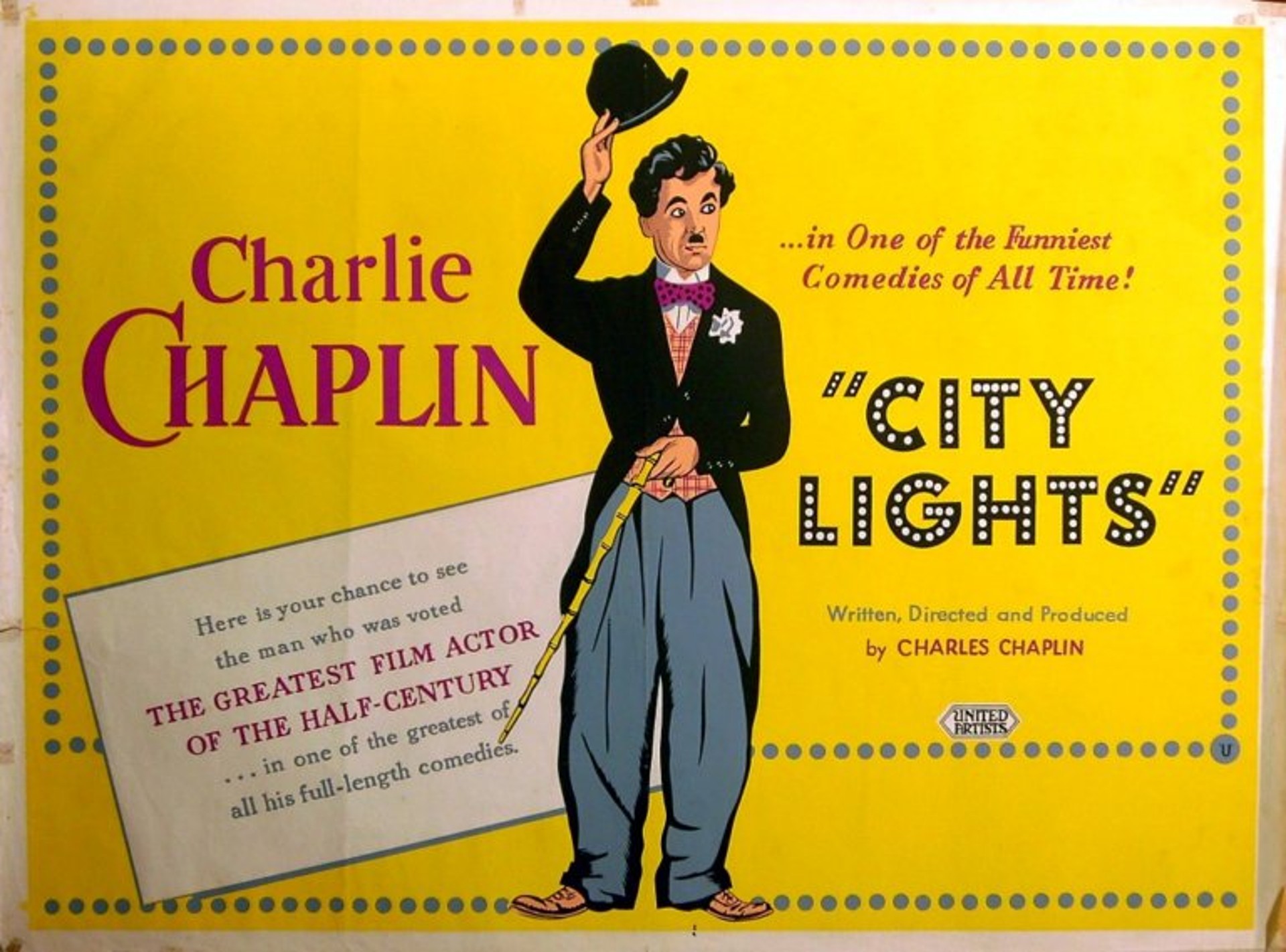 Original 1950s Re-Release British 30 inch x 40 inch Quad Poster for the 1931 Charlie Chaplin Romantic Comedy CITY LIGHTS starring Charles Chaplin, Virginia Cherrill, Florence Lee, Harry Myers, Al Ernest Garcia and Hank Mann.