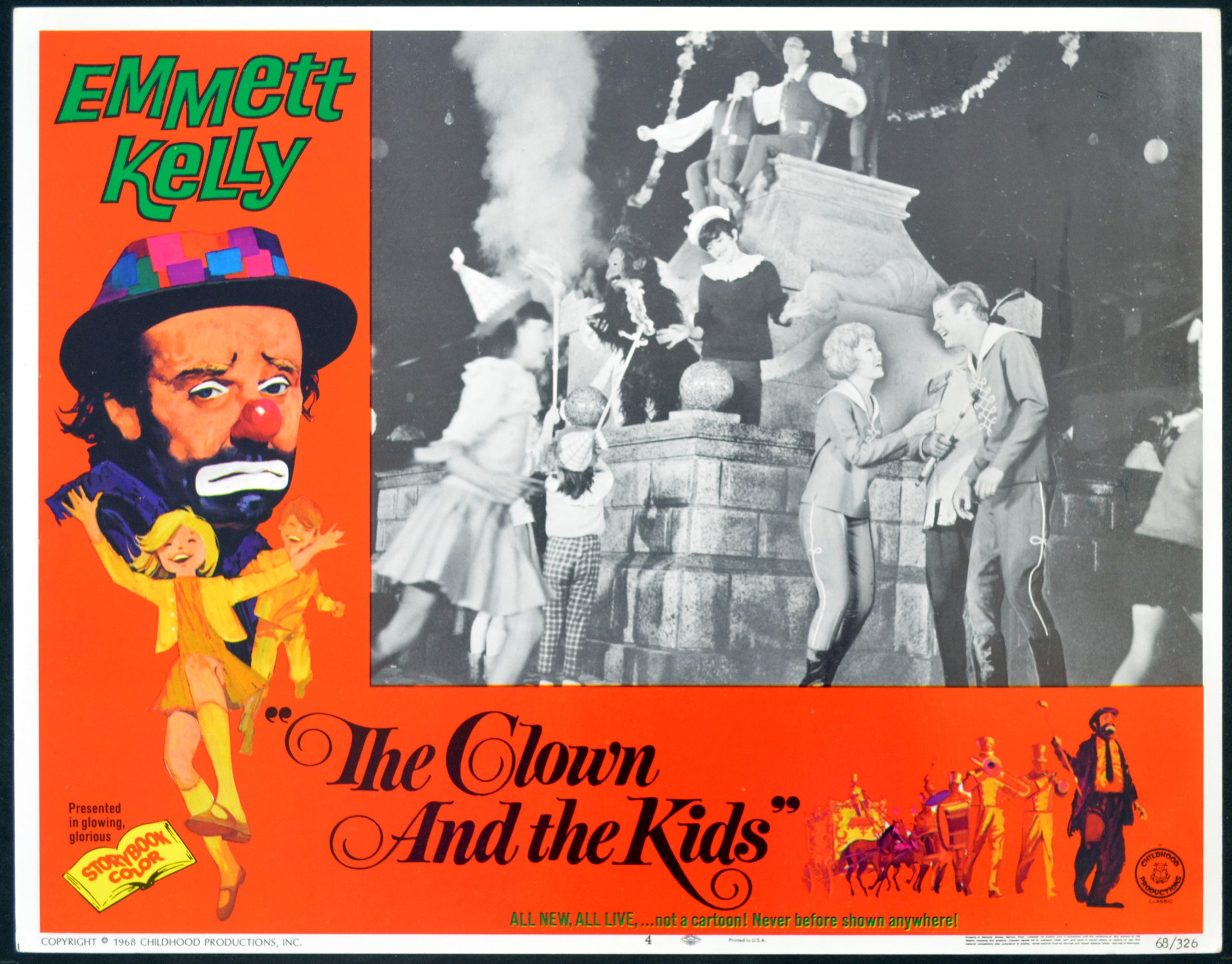 5 Original 11 inch x 14 inch U.S. Lobby Cards for the 1968 Mende Brown Drama THE CLOWN AND THE KIDS starring Emmett Kelley, Burt Stratford, Katie Dunn, Mikhail Mikhajlov and Leo Conforti.