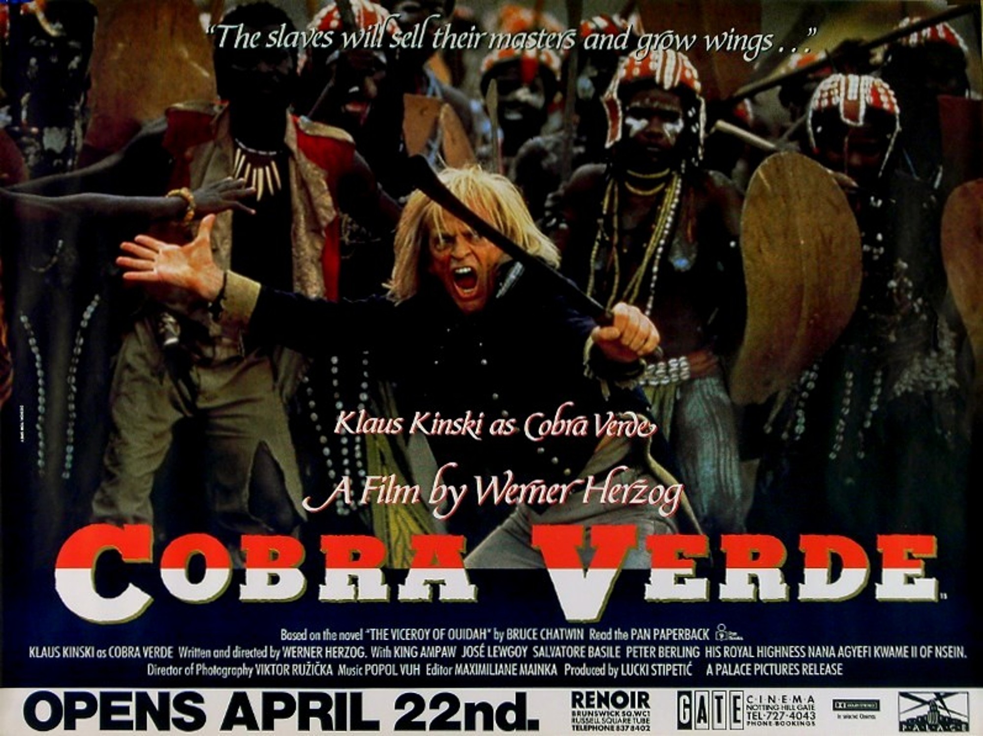 Original British 30 inch x 40 inch Quad Poster for the 1987 Werner Herzog Drama COBRA VERDE, based upon the 1980 Bruce Chatwin novel “The Viceroy of Ouidah” and starring Klaus Kinski, King Ampaw, José Lewgoy, Salvatore Basile, Peter Berling, Guillermo Coronel, Nana Agyefi Kwame II, Nana Fedu Abodo, Kofi Yerenkyi, Kwesi Fase, Benito Stefanelli, Cego Oliveira, Carlos Mayolo and Yolanda García.