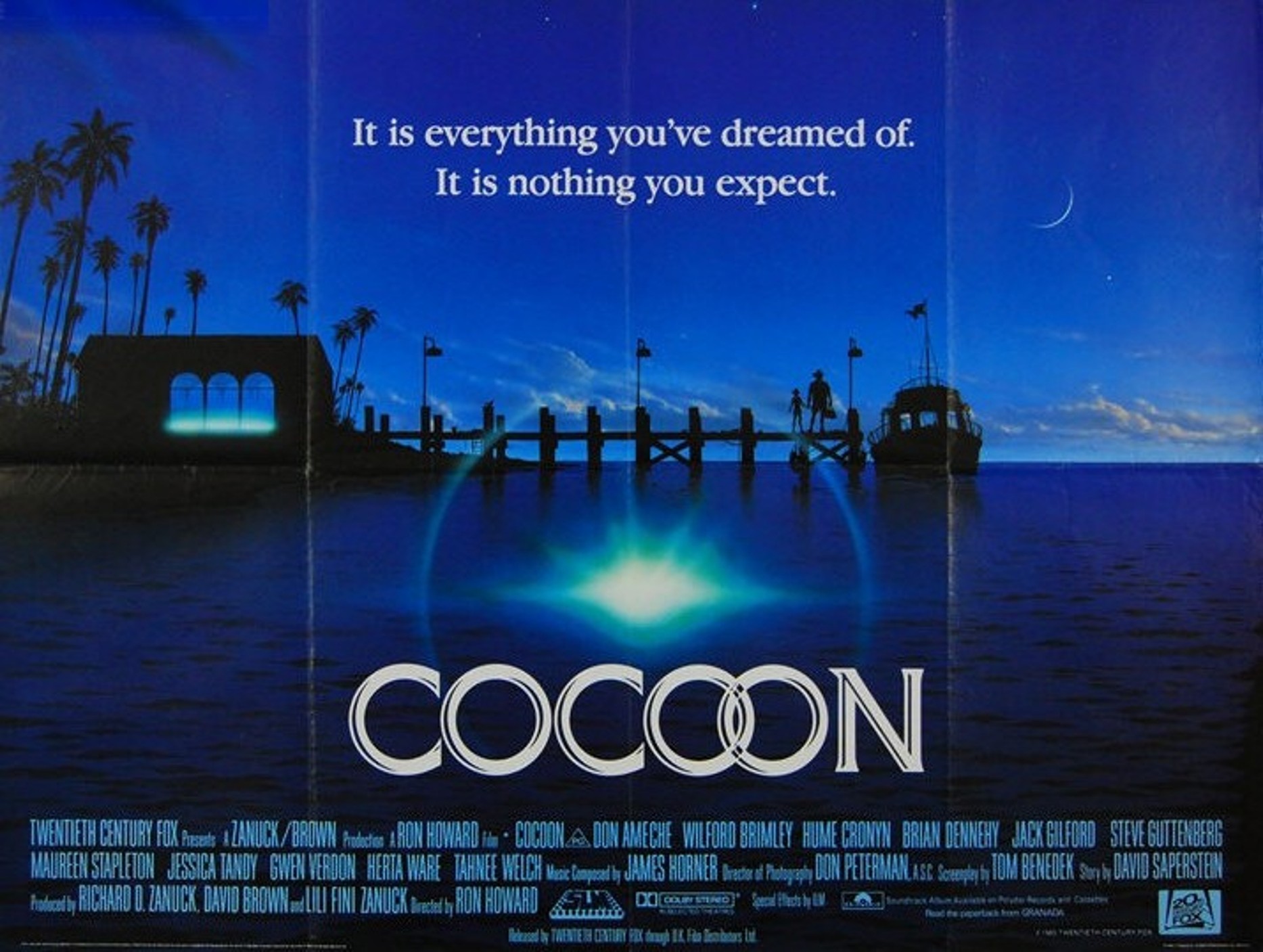 Original British 30 inch x 40 inch Quad Poster for the 1985 Ron Howard Sci-Fi Movie COCOON, based on the novel by John Nichols and starring Don Ameche, Wilford Brimley, Hume Cronyn, Brian Dennehy, Maureen Stapleton and Jessica Tandy.