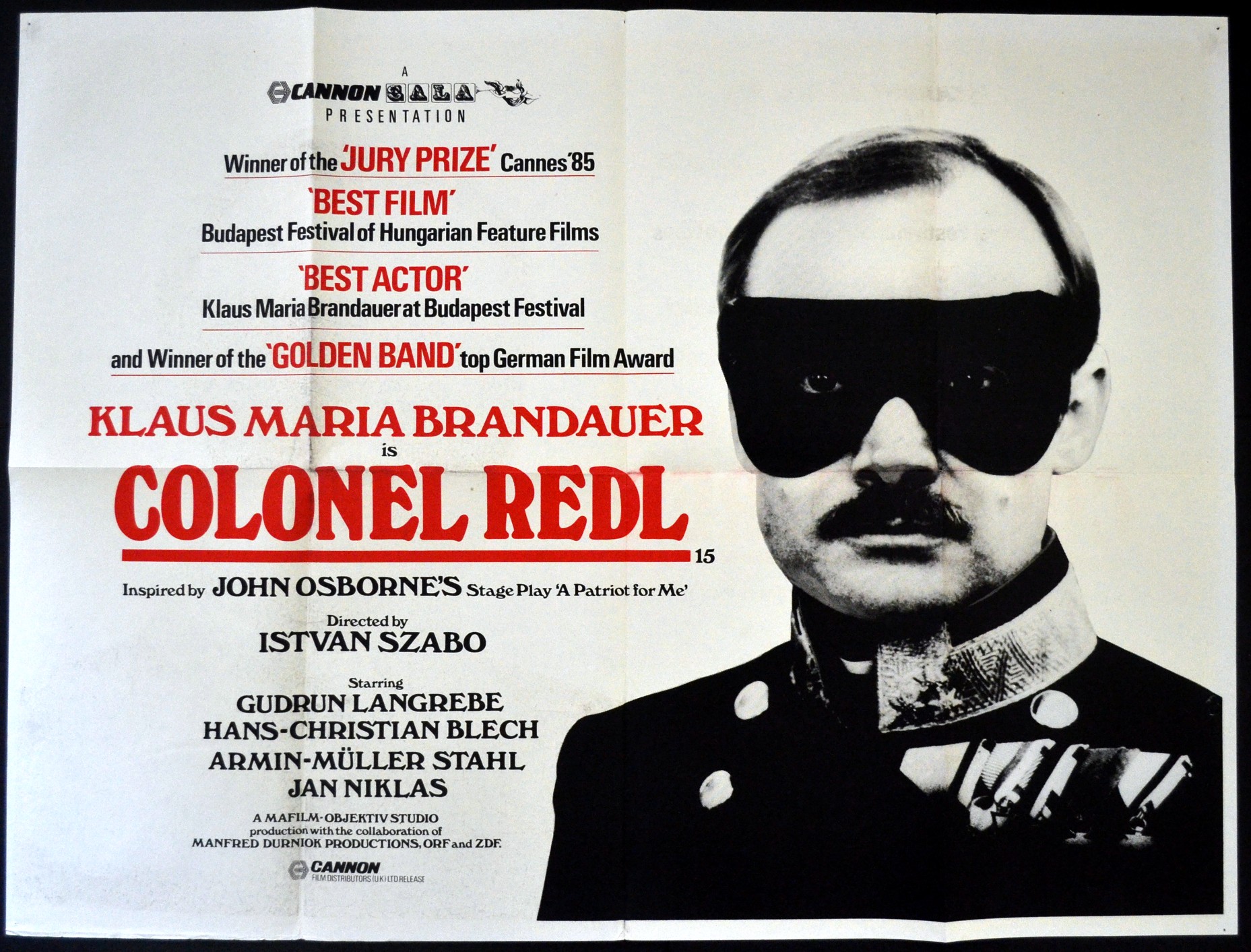 Original British 30 inch x 40 inch Quad Poster for the 1985 István Szabó Drama COLONEL REDL (OBERST REDL), based on the play by John Osborne and starring Klaus Maria Brandauer, Hans Christian Blech, Armin Mueller-Stahl, Gudrun Landgrebe, Jan Niklas, László Mensáros, András Bálint, László Gálffi, Dorottya Udvaros, Károly Eperjes, Róbert Rátonyi, Gábor Svidrony, Éva Szabó, Tamás Major, Mária Majláth, Péter Dobai, Pálfi Zoltán and Gyula Gazdag.