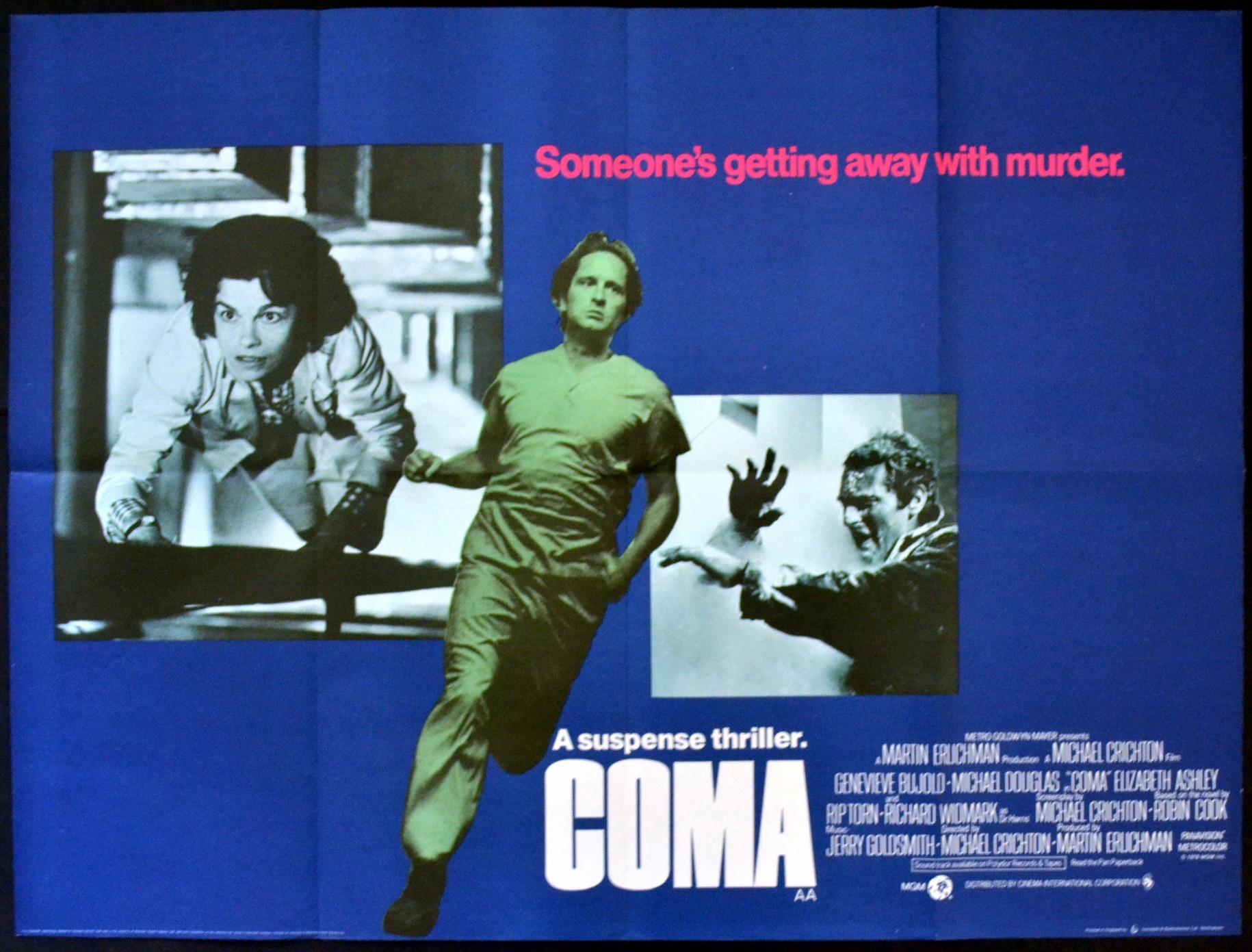 Original British 30 inch x 40 inch Quad Poster for the 1978 Michael Crichton Thriller COMA, based on the novel by Robin Cook and starring Geneviève Bujold, Michael Douglas, Elizabeth Ashley, Rip Torn, Richard Widmark, Lois Chiles, Hari Rhodes, Gary Barton, Frank Downing, Alan Haufrect, Lance LeGault, Michael MacRae, Betty McGuire, Tom Selleck, Joanna Kerns, Ed Harris, Richard Doyle, Benny Rubin, Charles Siebert, Martin Speer, Nicholas Worth and Ernest Anderson.