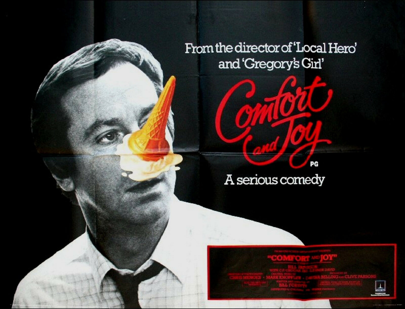 Original British 30 inch x 40 inch Quad Poster for the 1984 Bill Forsyth Comedy COMFORT AND JOY starring Bill Patterson, Eleanor David, Clare Grogan, Alex Norton, Patrick Malahide and Rikki Fulton.