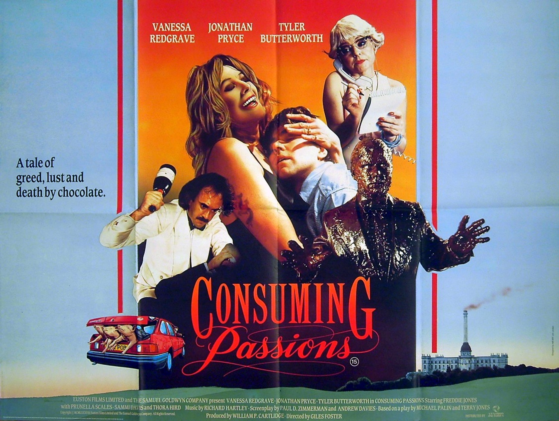 Original British 30 inch x 40 inch Quad Poster for the 1988 Giles Foster Comedy CONSUMING PASSIONS, based on the play by Michael Palin & Terry Jones and starring Jonathan Pryce, Freddie Jones, Vanessa Redgrave, Prunella Scales and Thora Hird.