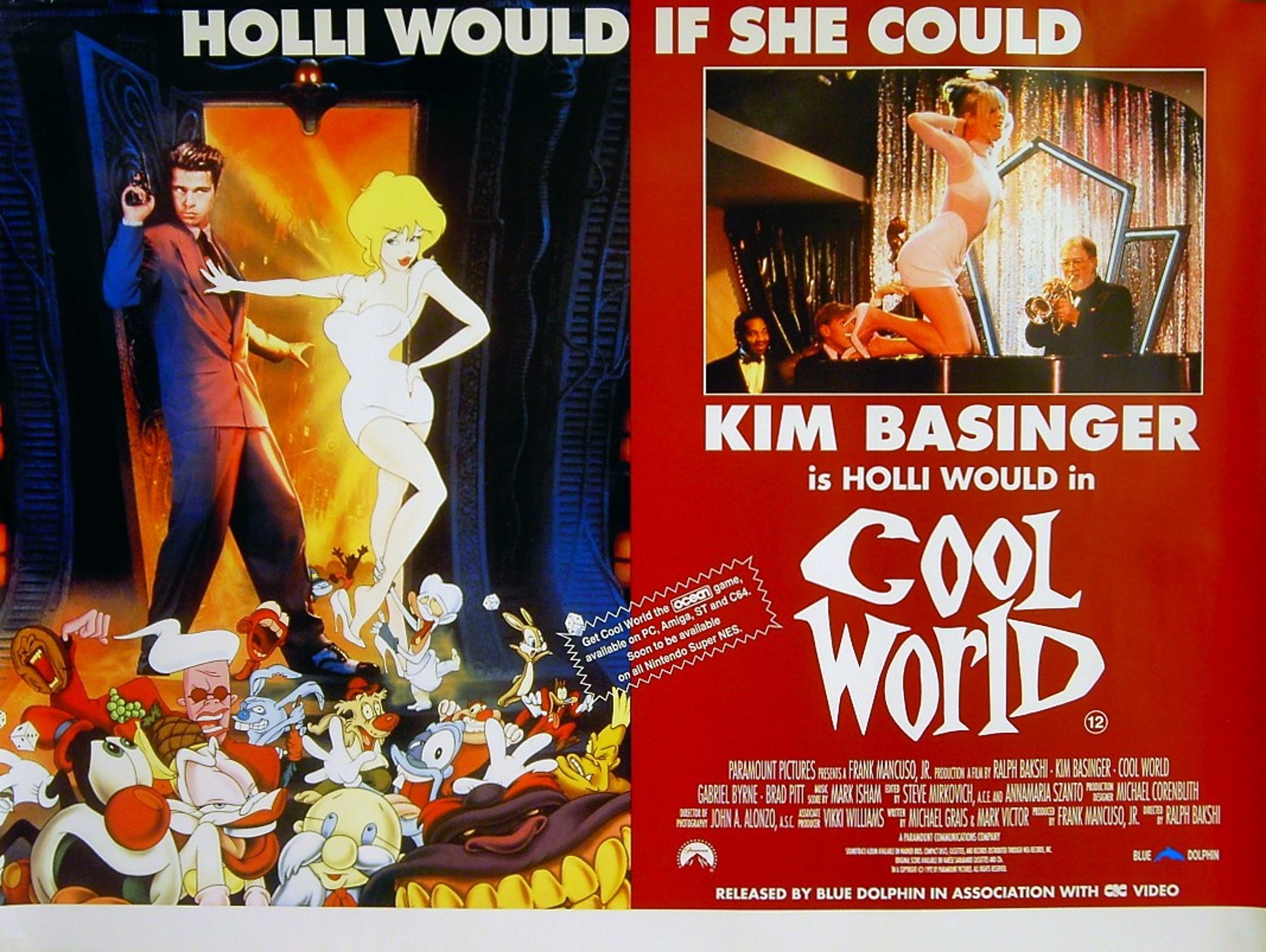 Original British 30 inch x 40 inch Quad Poster for the 1992 Ralph Bakshi Animation & Live Action Fantasy COOL WORLD starring Kim Basinger, Gabriel Byrne, Brad Pitt, Janni Brenn-Lowen and William Frankfather.