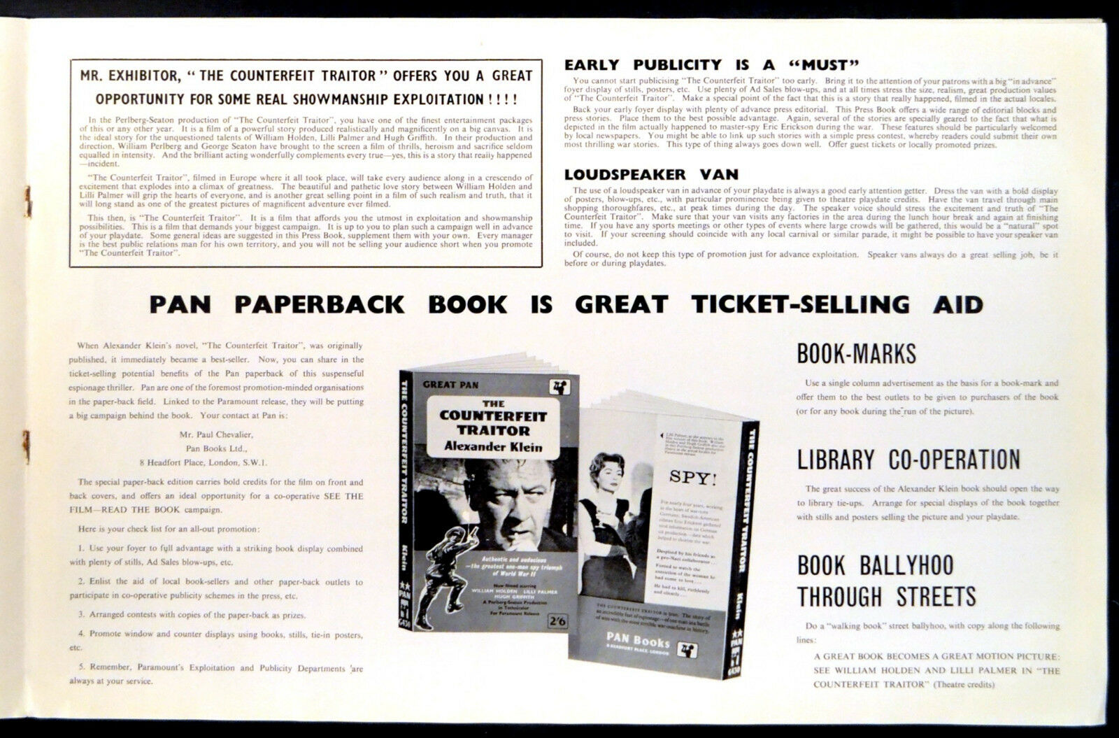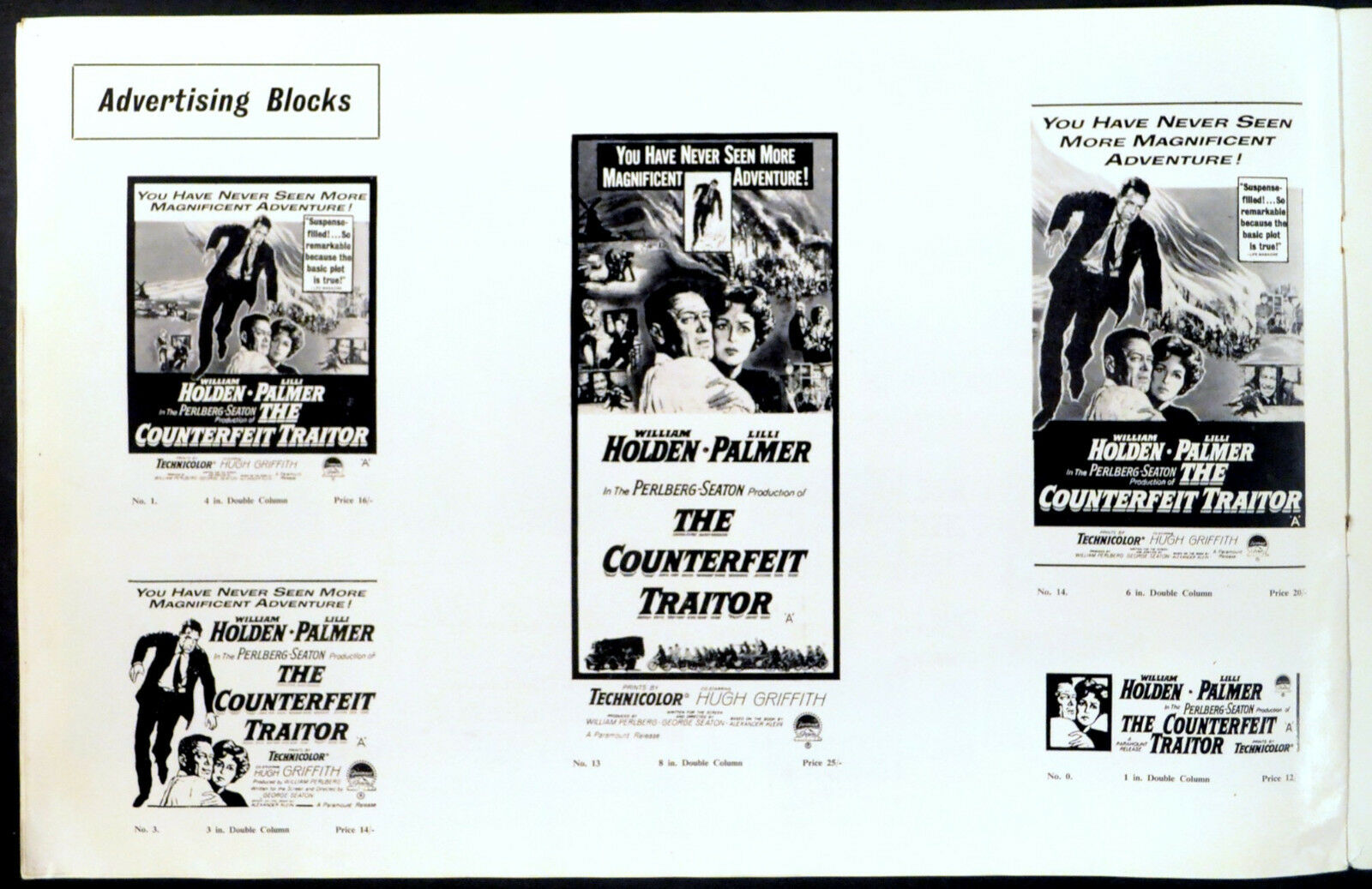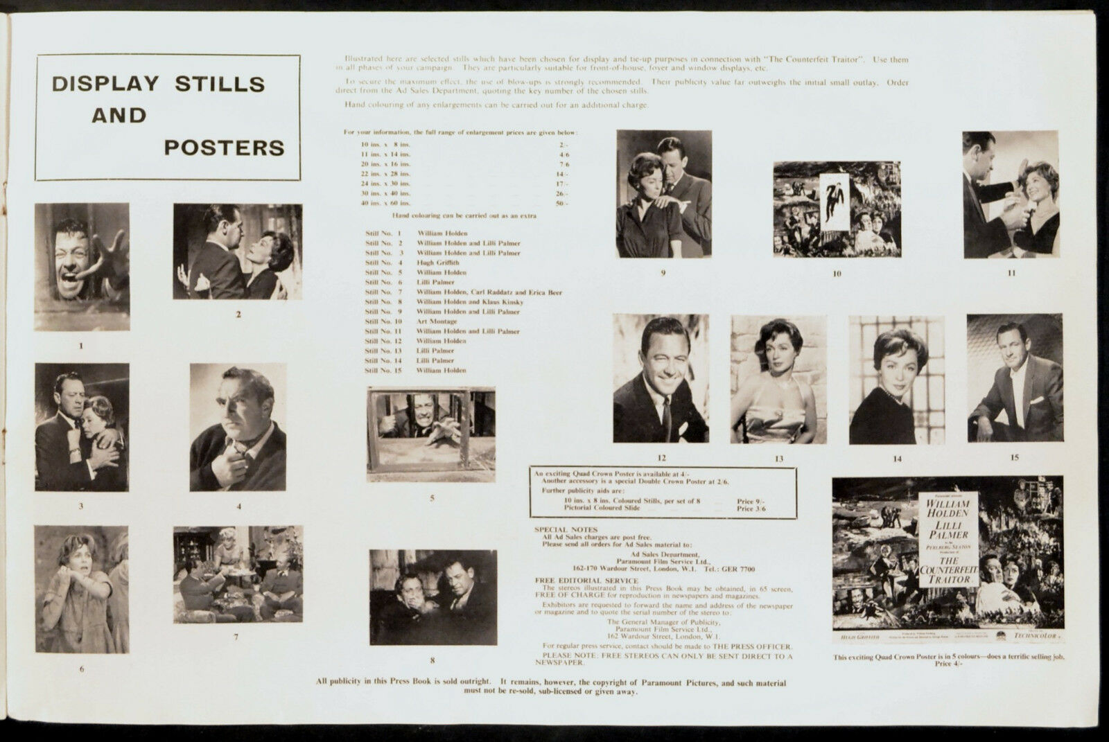 Original British 17 inch x 11 inch 12 page illustrated Campaign Book for the 1962 George Seaton Spy Thriller THE COUNTERFEIT TRAITOR, based on the book by Alexander Klein and starring William Holden, Lilli Palmer, Hugh Griffith, Eva Dahlbeck, Charles Regnier, Wolfgang Preiss, Carl Raddatz, Klaus Kinski and Ernst Schroder.