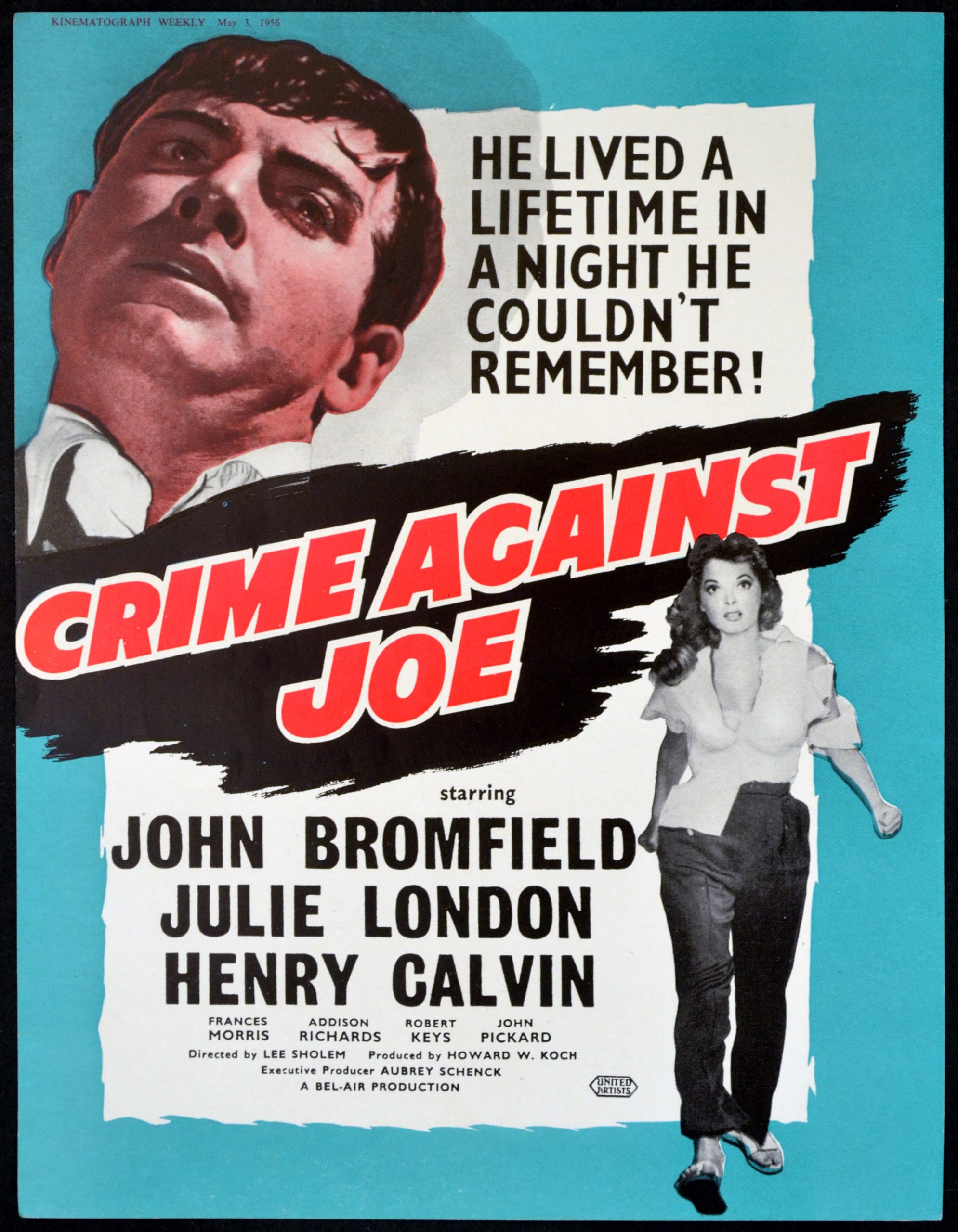 Original British 11 inch x 8 1/2 inch Trade Advertisement from Kinematograph Weekly for the 1956 Lee Sholem Thriller CRIME AGAINST JOE starring John Bromfield, Julie London, Henry Calvin, Frances Morris, Addison Richards, Robert Keys and John Pickard.