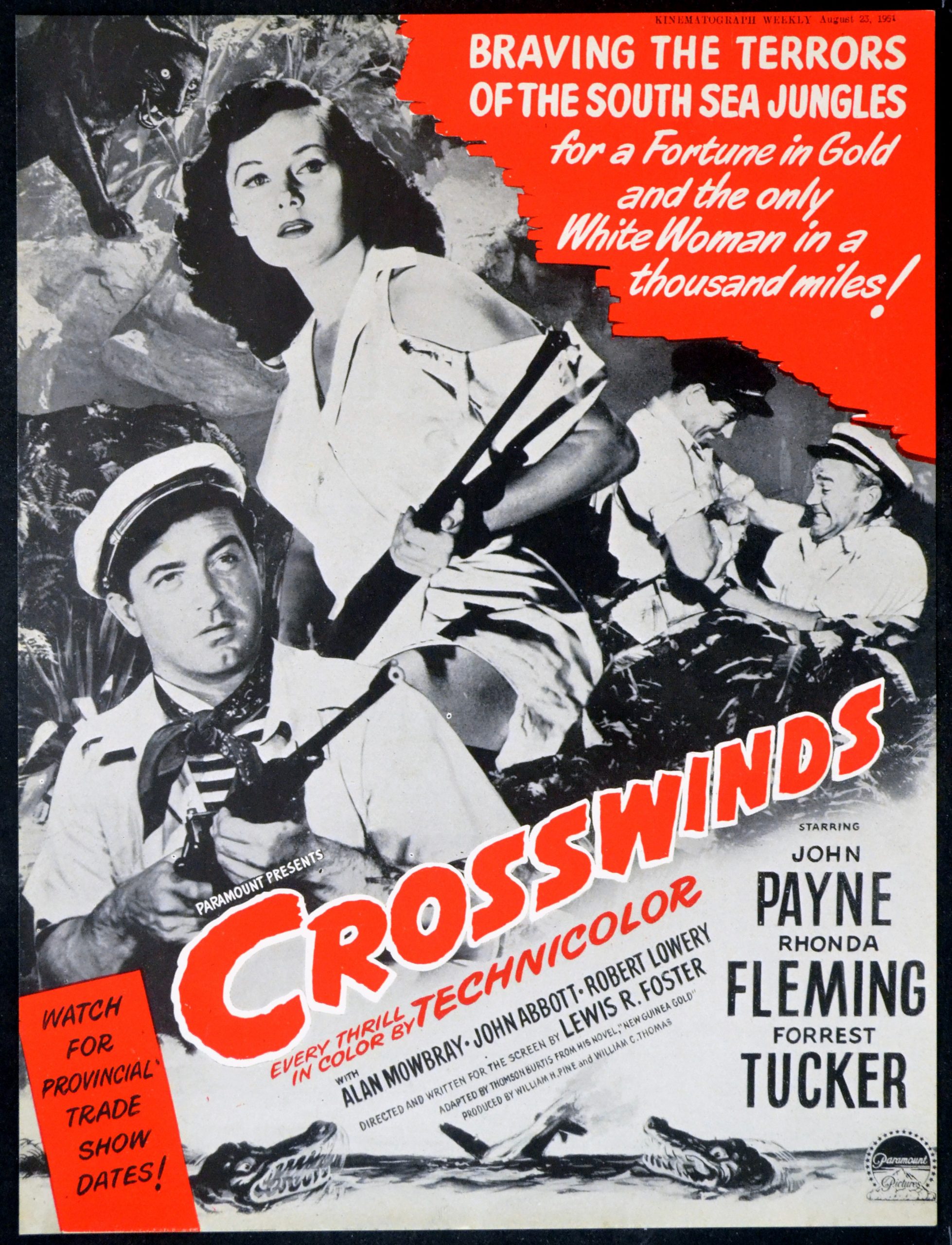 Original British 11 inch x 8 1/2 inch Trade Advertisement from Kinematograph Weekly for the 1951 Lewis R. Foster Thriller CROSSWINDS, based on the novel “New Guinea Gold” by Thomson Burtis and starring John Payne, Rhonda Fleming, Forrest Tucker, Alan Mowbray, John Abbott and Robert Lowery.