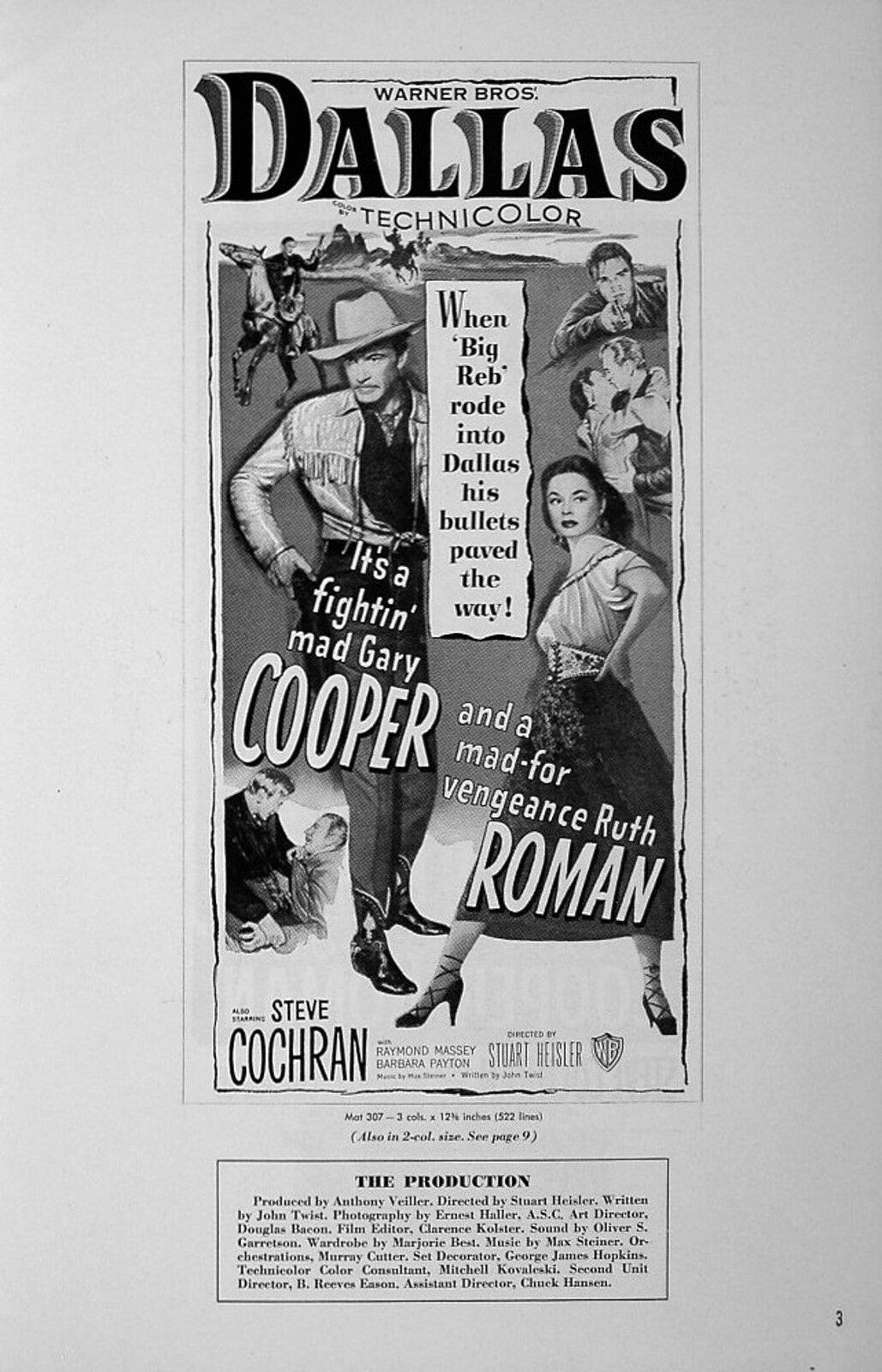 Original U.S. 11 inch x 17 inch 16 page illustrated Pressbook for the 1950 Stuart Heisler Western DALLAS starring Gary Cooper, Ruth Roman, Steve Cochran, Raymond Massey, Barbara Payton, Leif Erickson, Antonio Moreno, Jerome Cowan and Reed Hadley as Wild Bill Hickok.