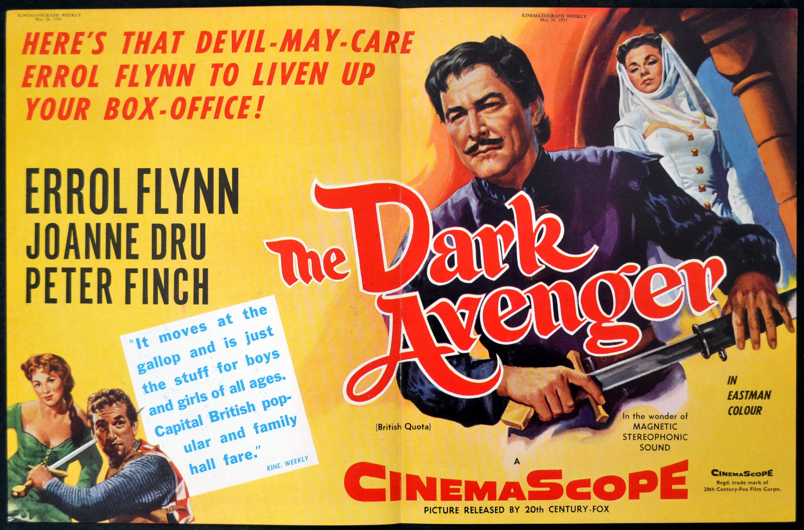 Original British 17 inch x 11 inch Trade Advertisement from Kinematograph Weekly for the 1955 Henry Levin Adventure THE DARK AVENGER starring Errol Flynn, Joanne Dru, Peter Finch, Yvonne Furneaux, Patrick Holt, Michael Hordern, Moultrie Kelsall, Robert Urquhart and Noel Willman.
