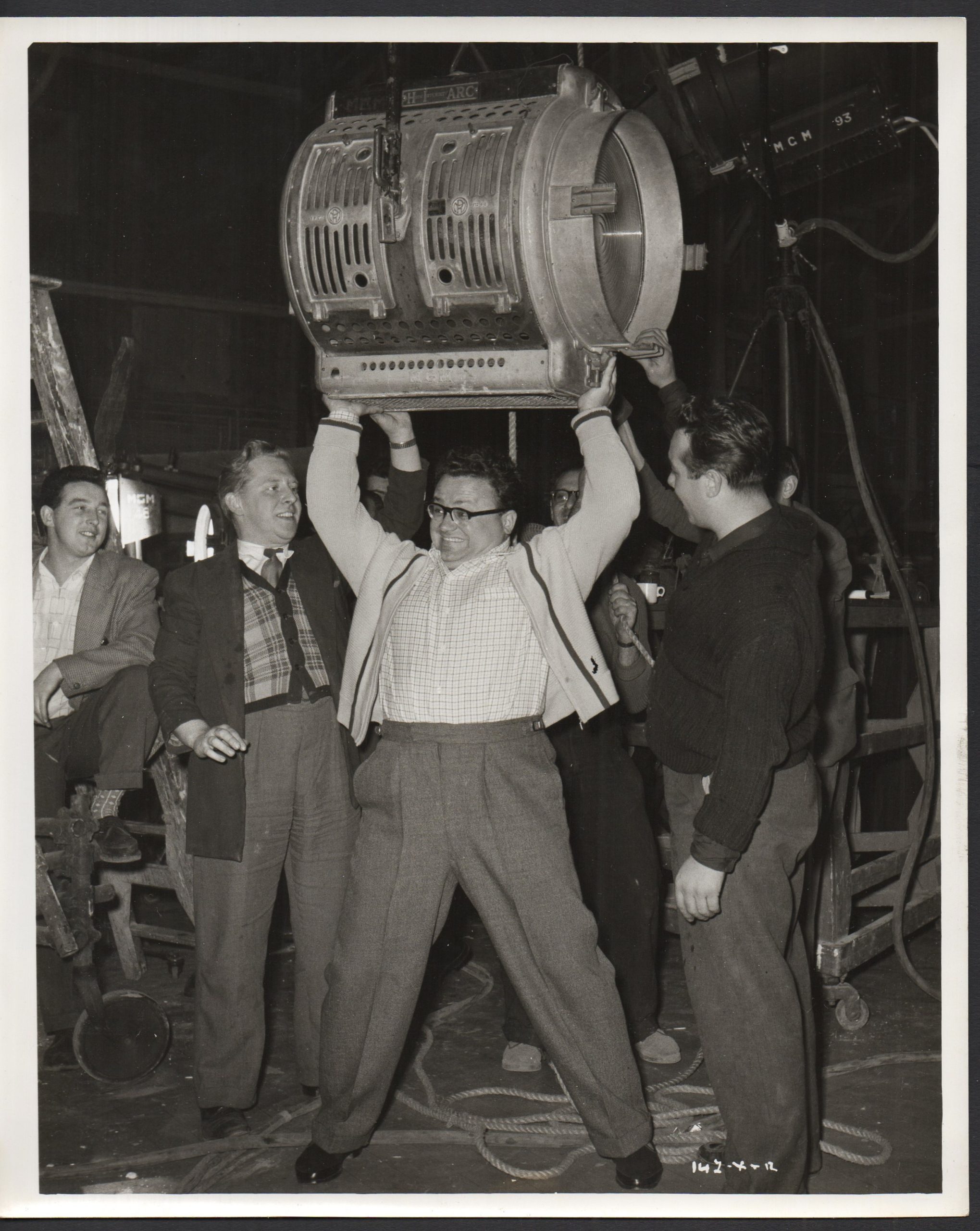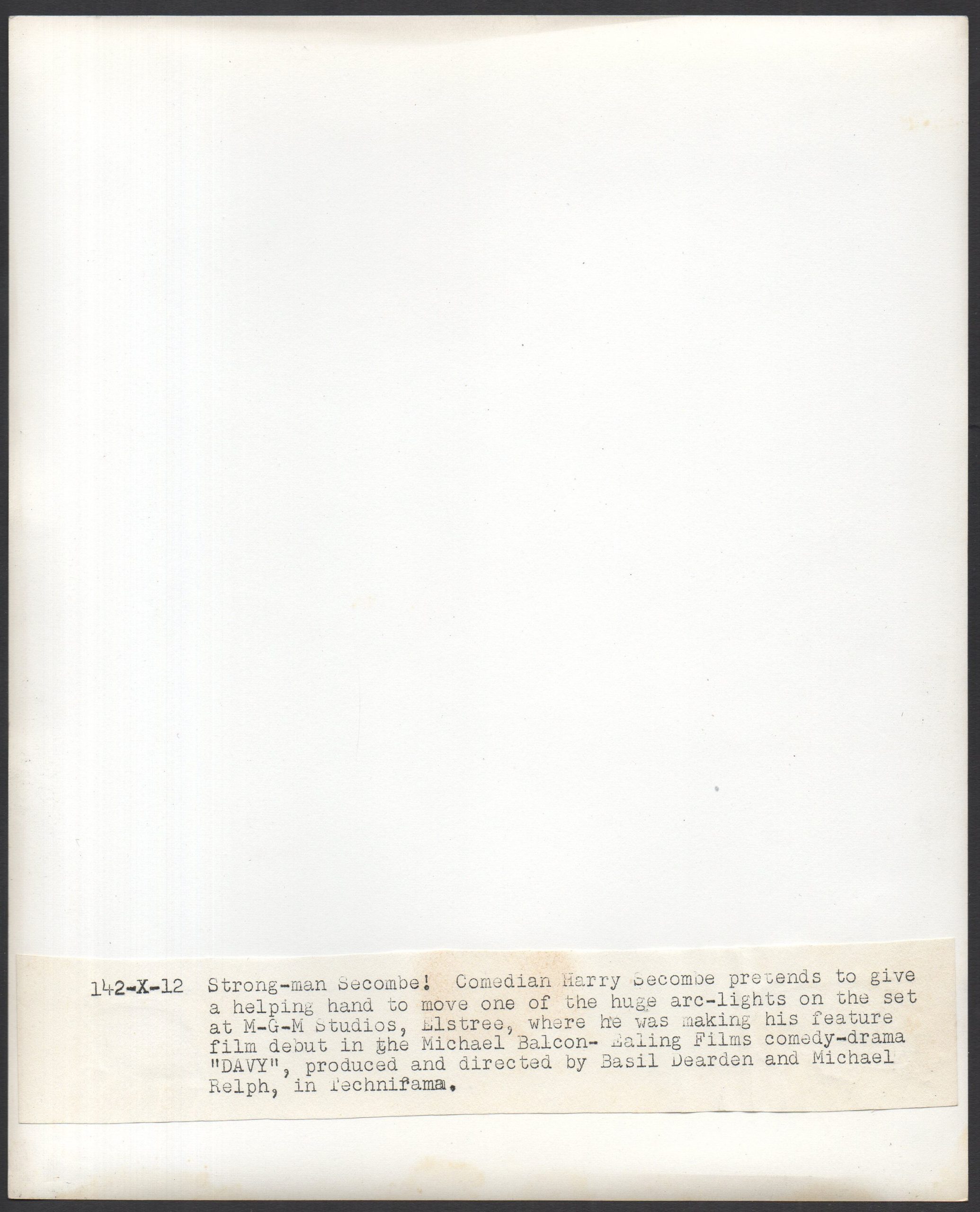 Text attached to reverse: Strong-man Secombe! Comedian Harry Secombe pretends to give a helping hand to move one of the huge arc-lights on the set at M-G-M Studios, Elstree, where he was making his feature film debut in the Michael Balcon-Ealing Films production “DAVY”, directed and produced by Michael Relph and Basil Dearden, in Technirama.