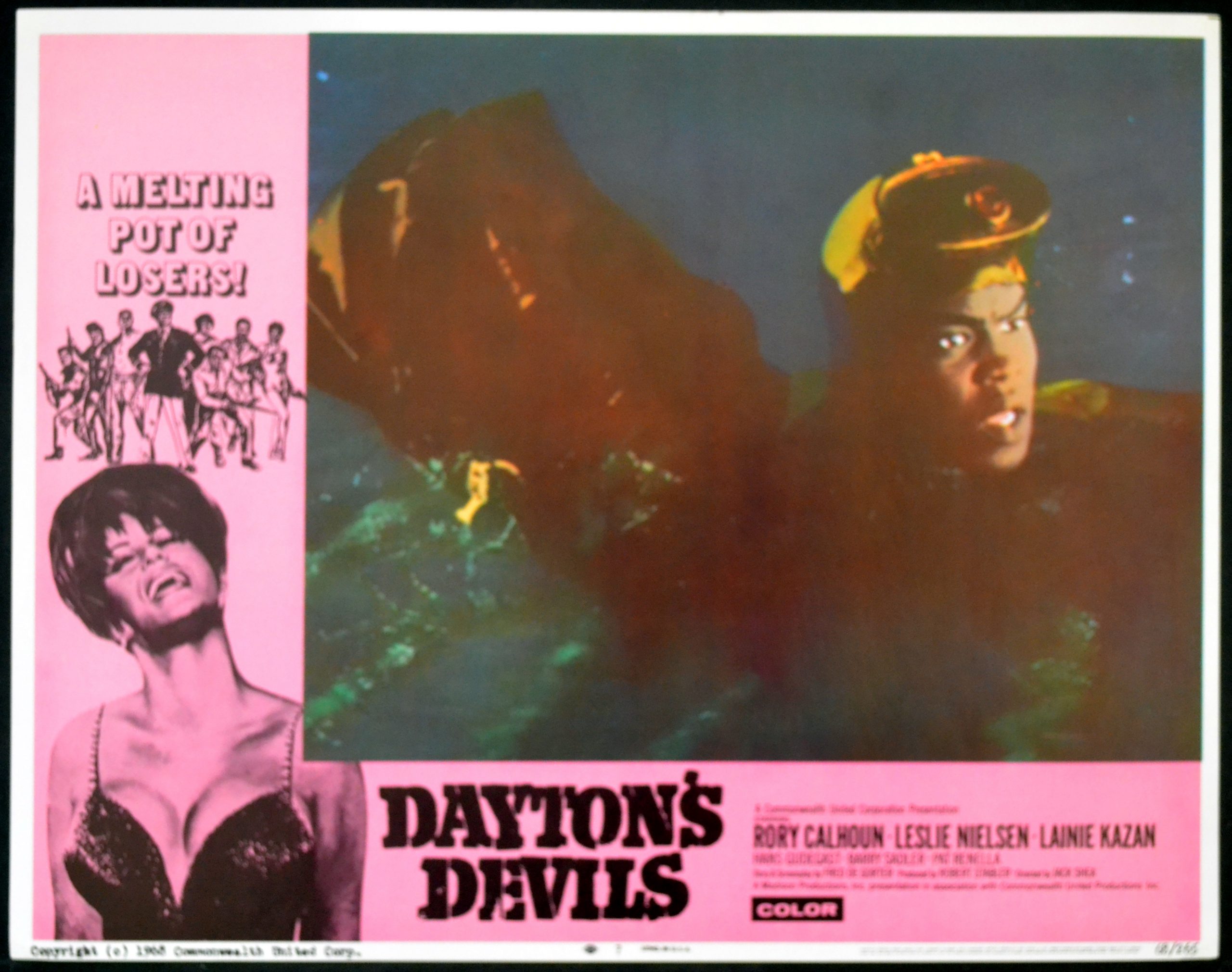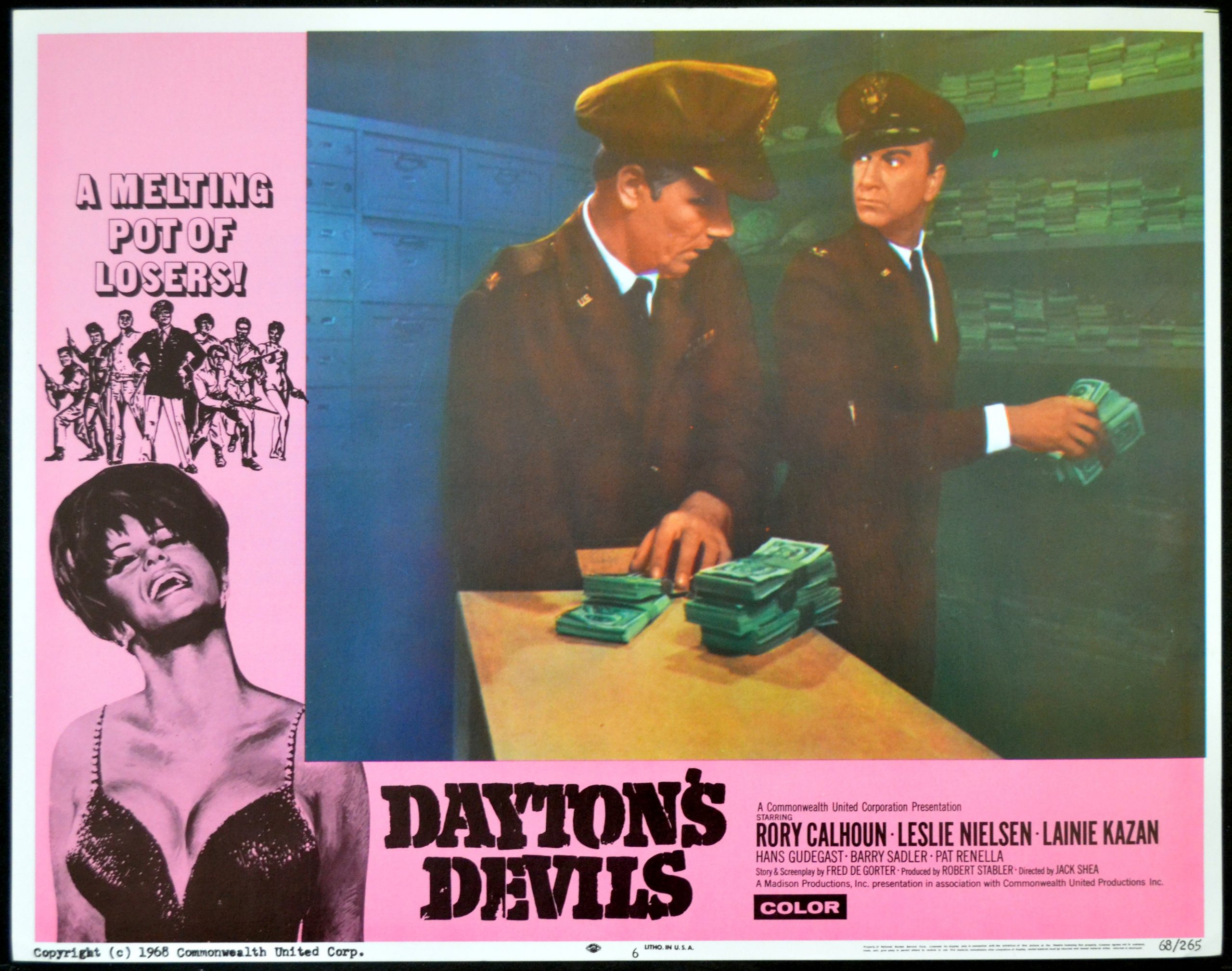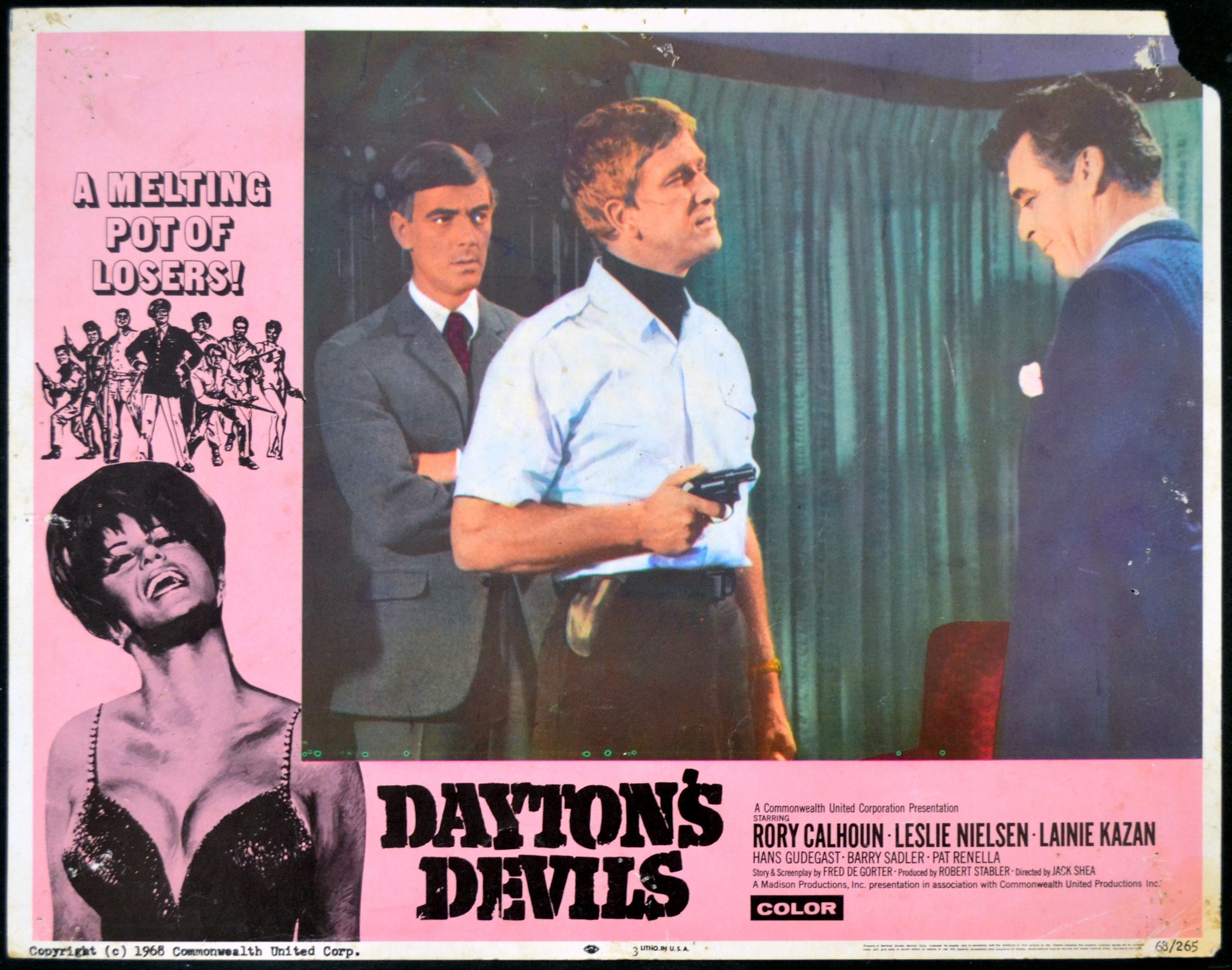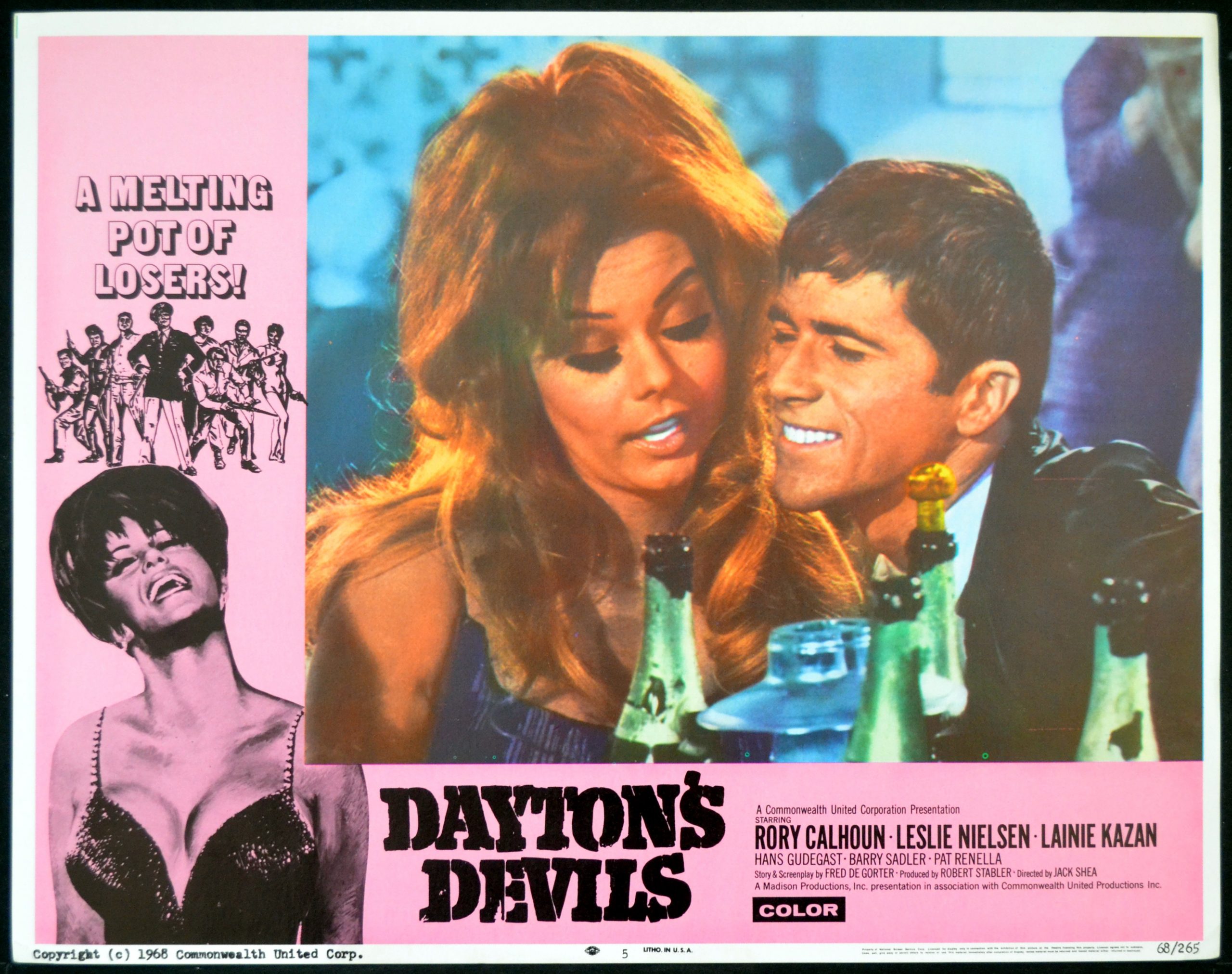 5 Original 11 inch x 14 inch U.S. Lobby Cards for the 1968 Jack Shea Crime Drama DAYTON’S DEVILS, based on a story by Fred De Gorter and starring Rory Calhoun, Leslie Nielsen, Lainie Kazan, Eric Braeden, Georg Stanford Brown, Barry Sadler, Pat Renella and Rodolfo Acosta.