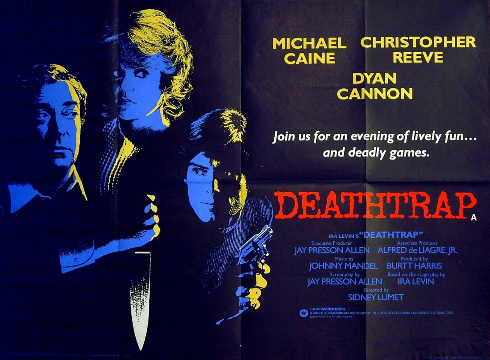 Original British 30 inch x 40 inch Quad Poster for the 1982 Sidney Lumet Thriller DEATHTRAP, based on the stage play by Ira Levin starring Michael Caine, Christopher Reeve, Dyan Cannon, Irene Worth, Henry Jones and Joe Silver.