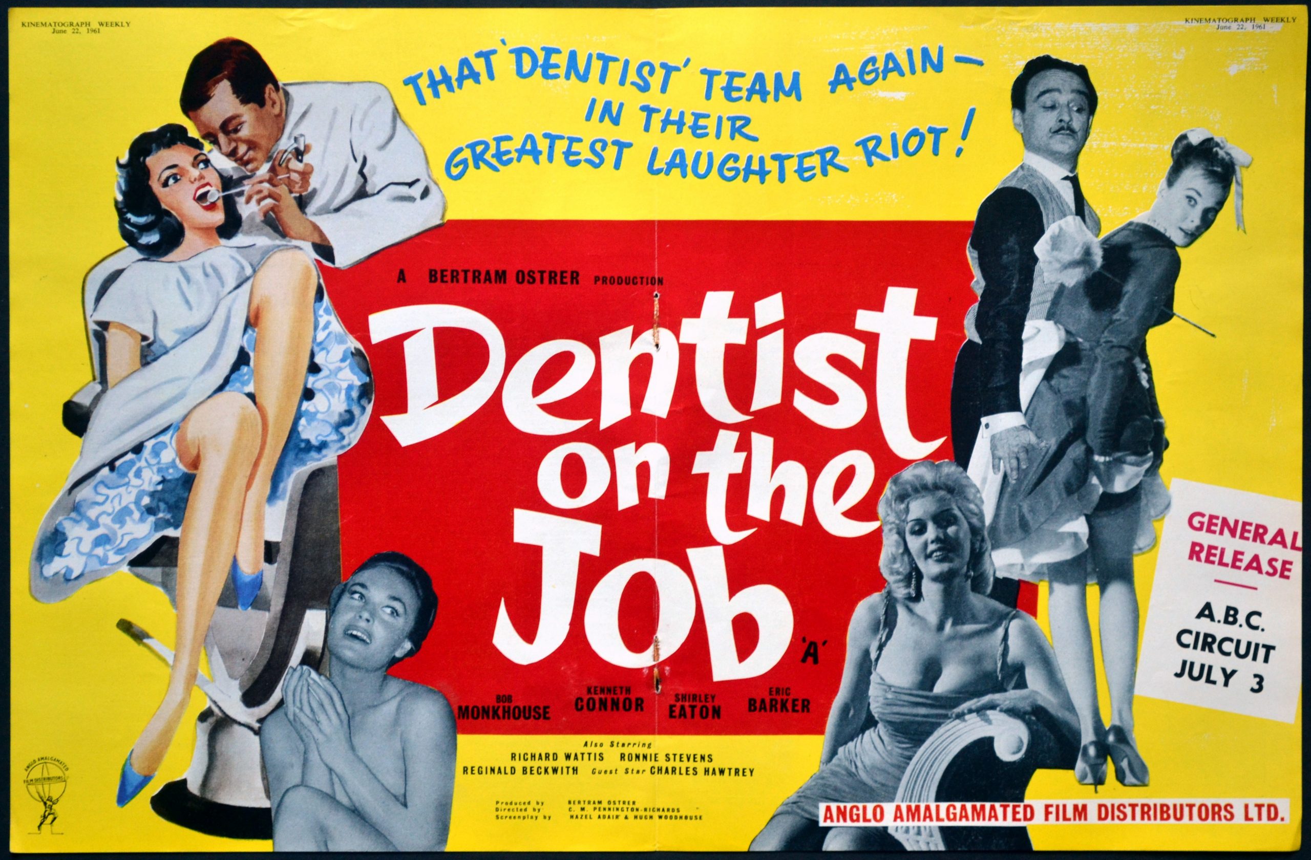 Original British 11 inch x 17 inch Trade Advertisement for the 1961 C.M. Pennington-Richards Comedy DENTIST ON THE JOB starring Bob Monkhouse, Eric Barker, Kenneth Connor, Shirley Eaton, Ronnie Stevens, Reginald Beckwith, Richard Wattis, Charles Hawtrey, Michael Miles, Graham Stark, Sheena Marshe and Valerie Pitts.