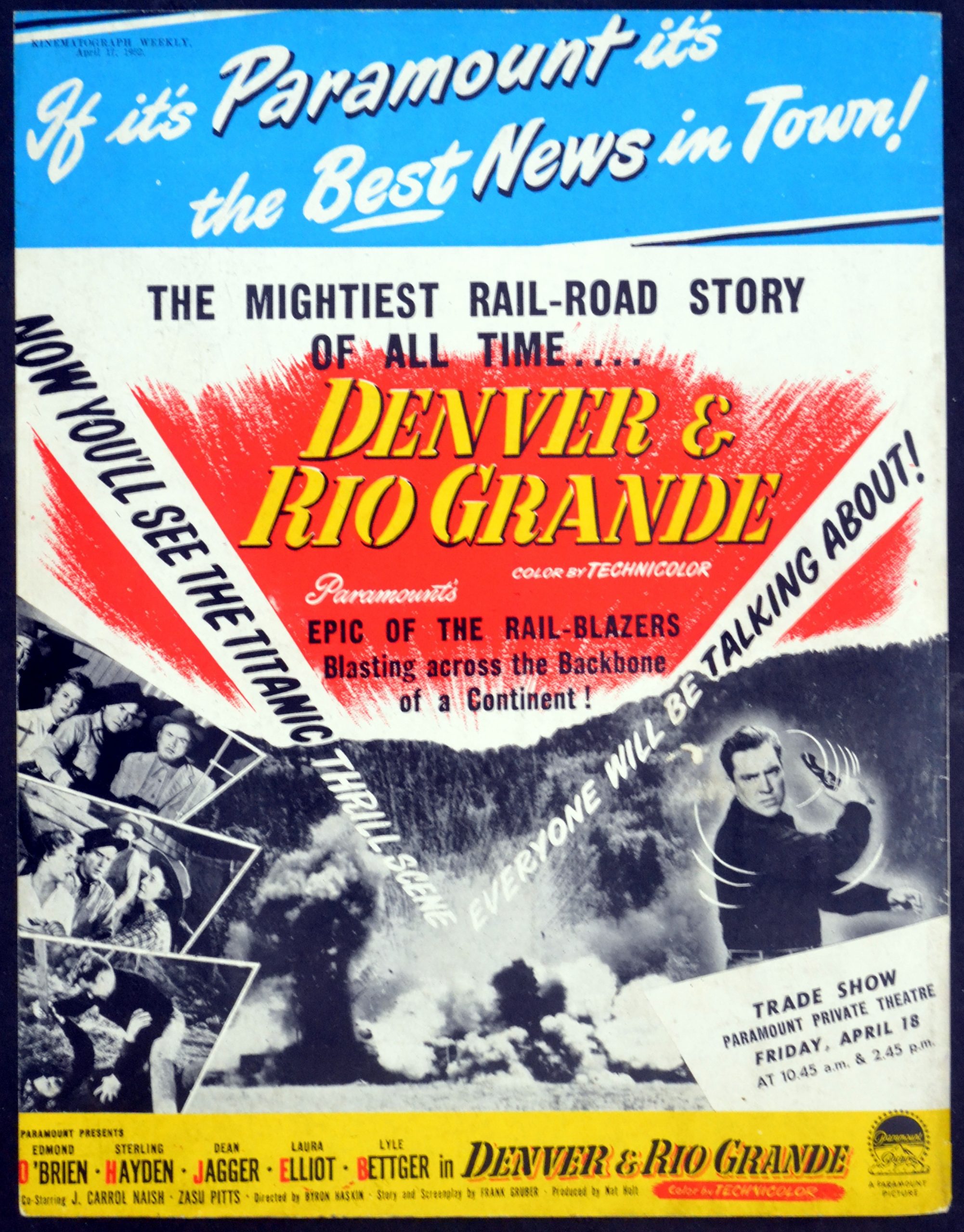 Original British 11 inch x 8 1/2 inch Trade Advertisement from Kinematograph Weekly for the 1952 Byron Haskin Western DENVER AND RIO GRANDE, from a story by Frank Gruber and starring Edmond O’Brien, Sterling Hayden, Dean Jagger, Kasey Rogers, Lyle Bettger, J. Carrol Naish, Zasu Pitts, Tom Powers, Robert Barrat, Paul Fix, Don Haggerty and James Burke.