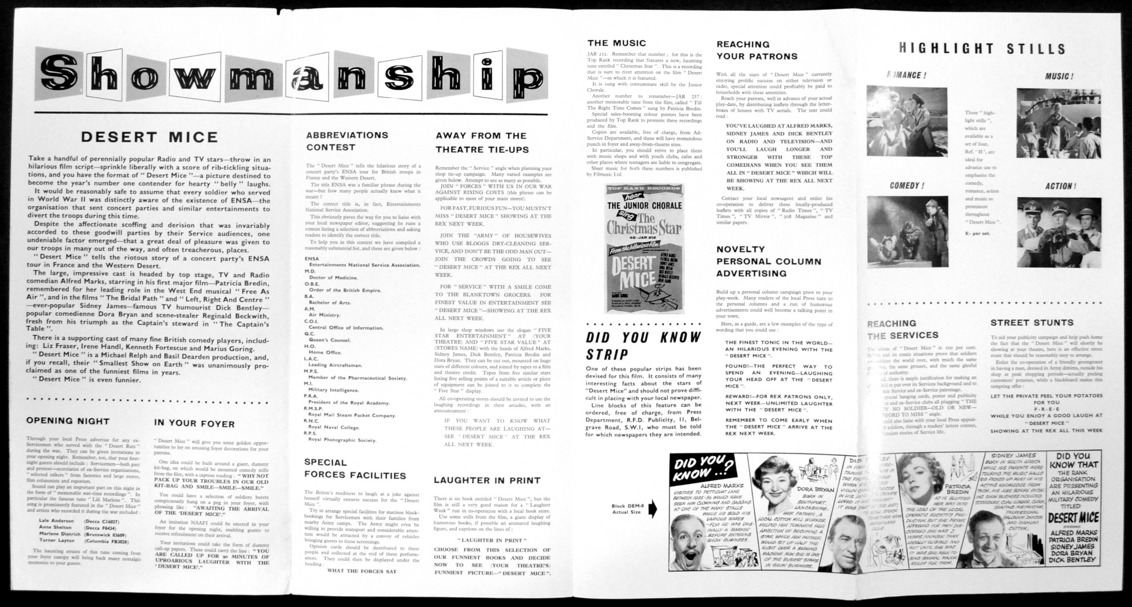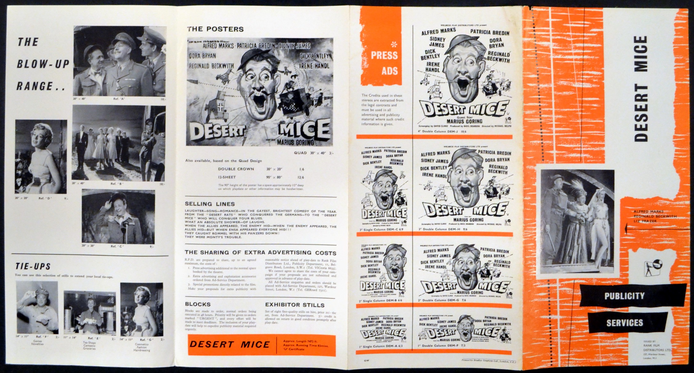 Original British 13 1/2 inch x 6 1/2 inch illustrated Pressbook for the 1959 Michael Relph World War II Comedy DESERT MICE starring Alfred Marks, Dora Bryan, Reginald Beckwith, Irene Handl, Patricia Bredin, Sidney James, Marius Goring and Liz Fraser..