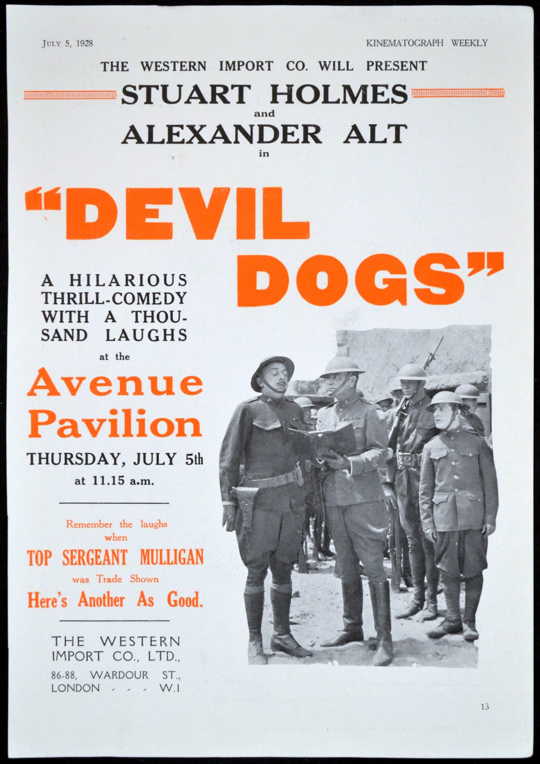 Original British 12 inch x 8 3/8 inch Trade Advertisement from Kinematograph Weekly for the 1928 Fred Windemere Comedy DEVIL DOGS starring Alexander Alt, Pauline Curley, Stuart Holmes, Ernest Hilliard and J.P. McGowan.