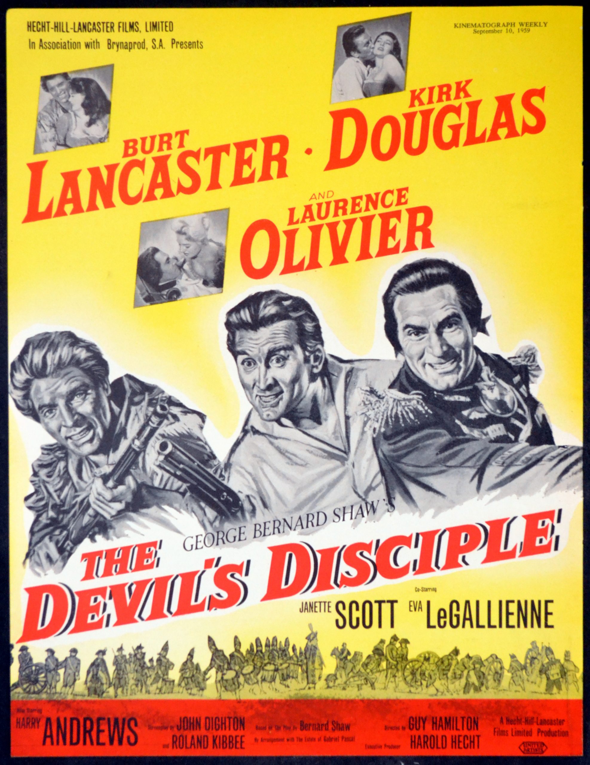 Original British 11 inch x 8 1/2 inch Double-Sided Trade Advertisement from Kinematograph Weekly for the 1959 Guy Hamilton Historical Drama THE DEVIL’S DISCIPLE, based on the play by George Bernard Shaw and starring Burt Lancaster, Kirk Douglas, Laurence Olivier, Janette Scott, Eva LeGallienne, Harry Andrews, Basil Sydney, George Rose, Neil McCallum, Mervyn Johns and David Horne.