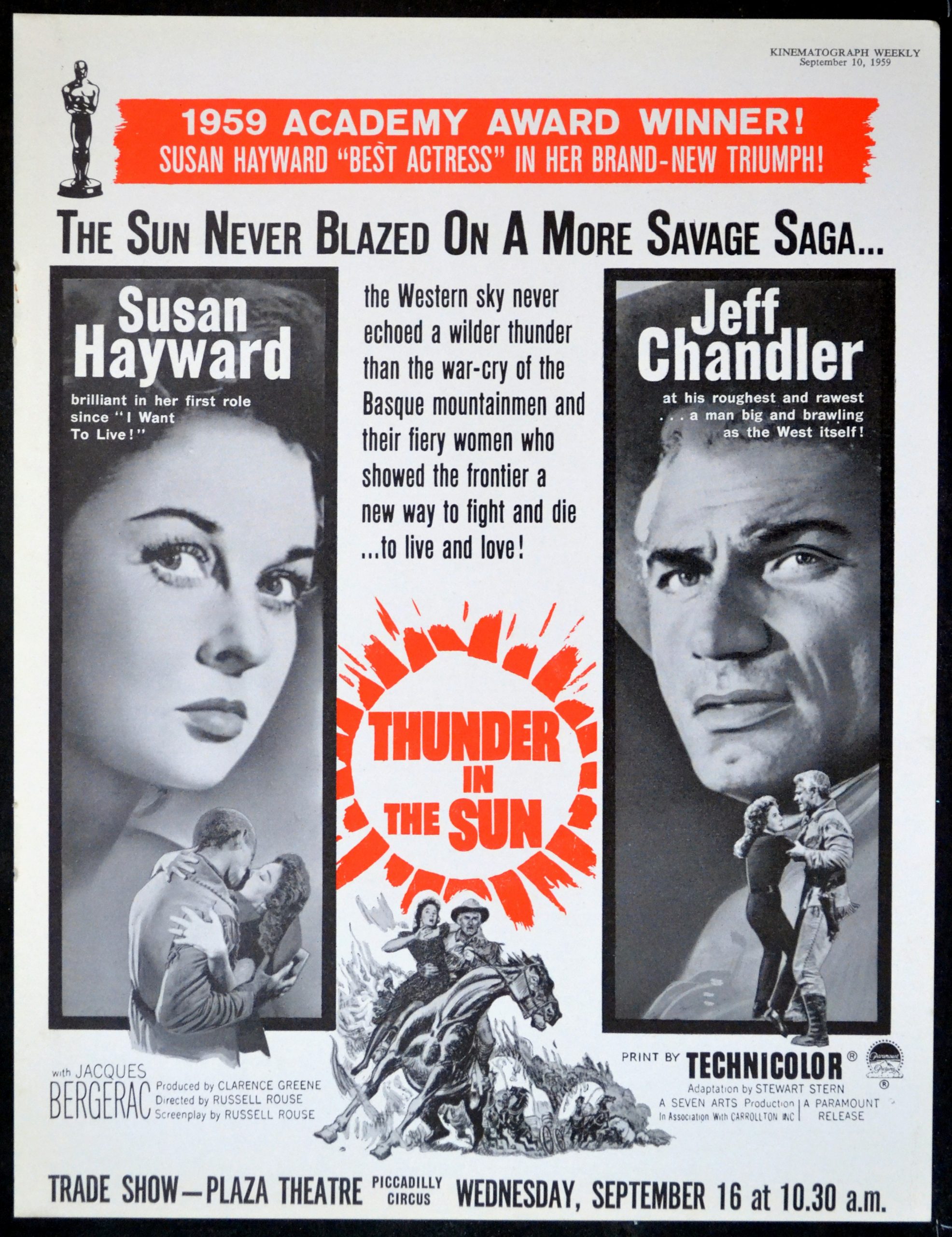 On the reverse is the 11 inch x 8 1/2 inch Trade Advertisement for the 1959 Russell Rouse Western THUNDER IN THE SUN, based on a story by James Hill and starring Susan Hayward, Jeff Chandler and Jacques Bergerac.