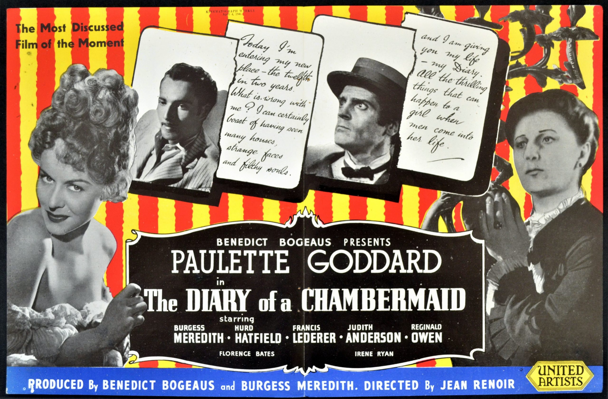 Original British 11 inch x 17 inch Trade Advertisement for the 1946 Jean Renoir Drama THE DIARY OF A CHAMBERMAID, adapted from the novel by Octave Mirbeau and starring Paulette Goddard, Burgess Meredith, Hurd Hatfield, Francis Lederer, Judith Anderson, Florence Bates, Irene Ryan and Reginald Owen.