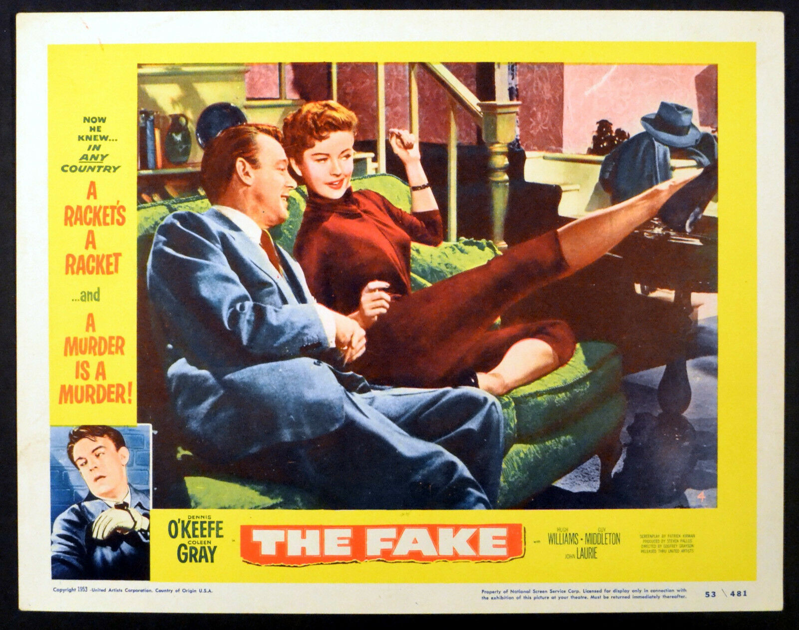 Original 11 inch x 14 inch U.S. Lobby Card of DENNIS O’KEEFE & COLEEN GRAY in the 1953 Godfrey Grayson Crime Drama THE FAKE.