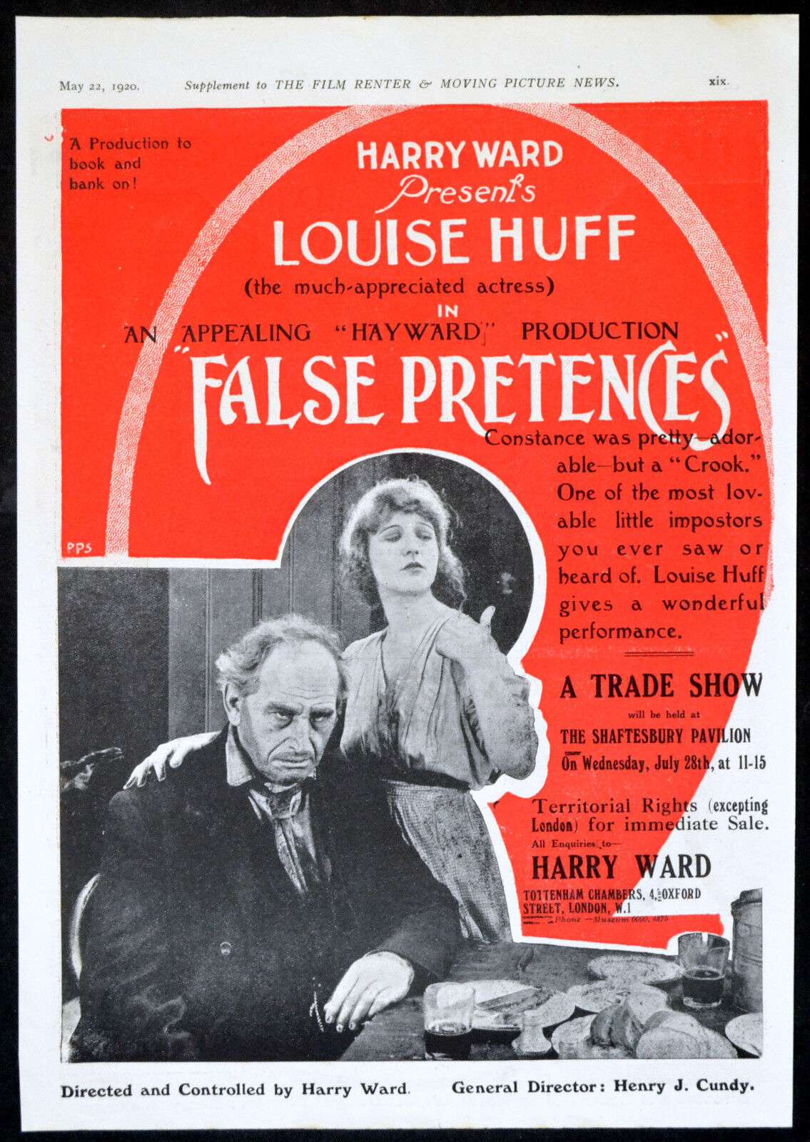Original British 11 3/4 inch x 8 1/4 inch Trade Advertisement from The Film Renter & Moving Picture News for the 1920 Harry Ward Drama FALSE PRETENCES starring Louise Huff.